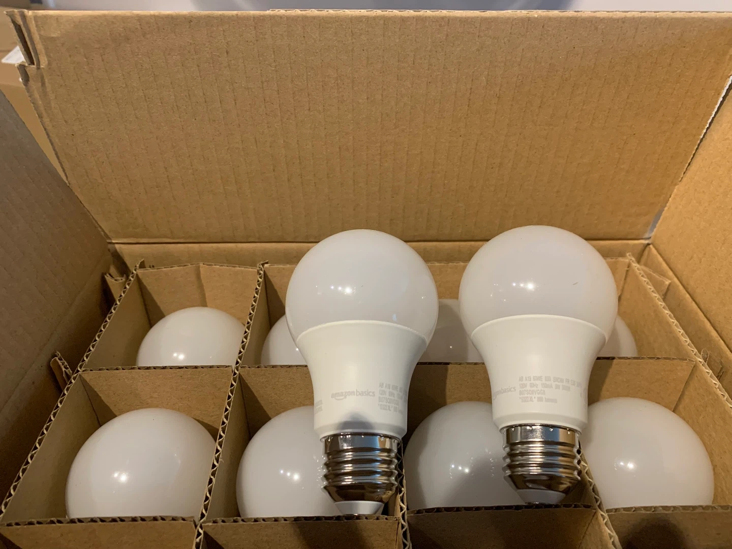 These are Amazon Basics A19 LED light bulbs. They provide 60W equivalent brightness while using only 9W. The colour temperature is 5000K daylight white. This is a 24-pack.