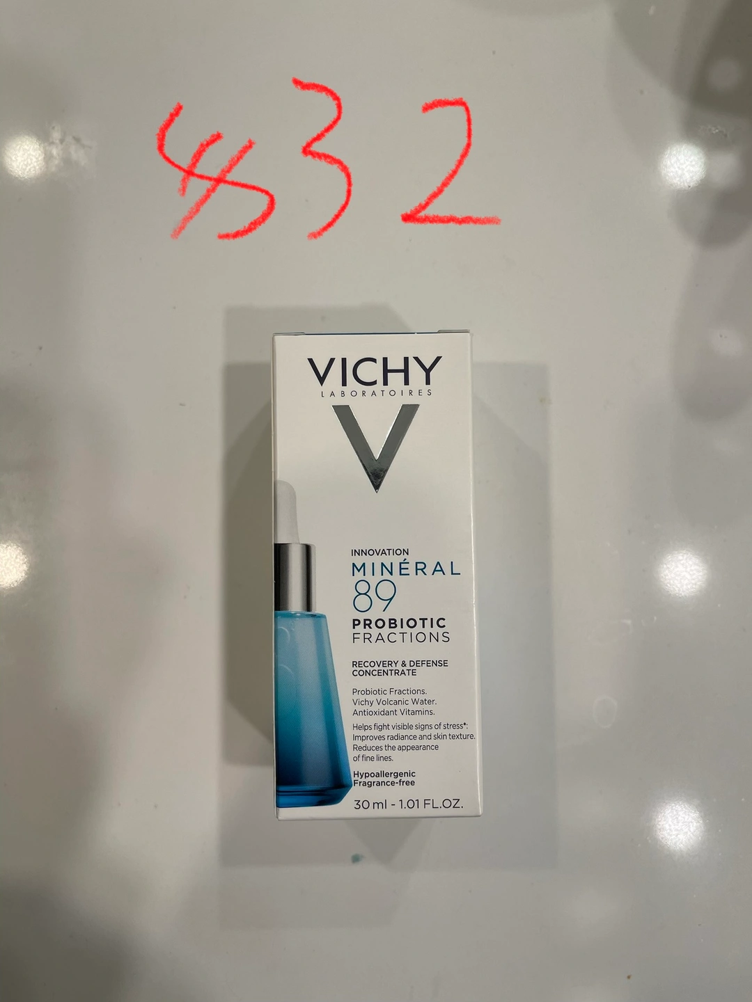 Vichy Minéral 89 Probiotic Fractions Recovery & Defense Concentrate. Includes Probiotic Fractions, Vichy Volcanic Water, and Antioxidant Vitamins. It's hypoallergenic and fragrance-free. 30 ml.