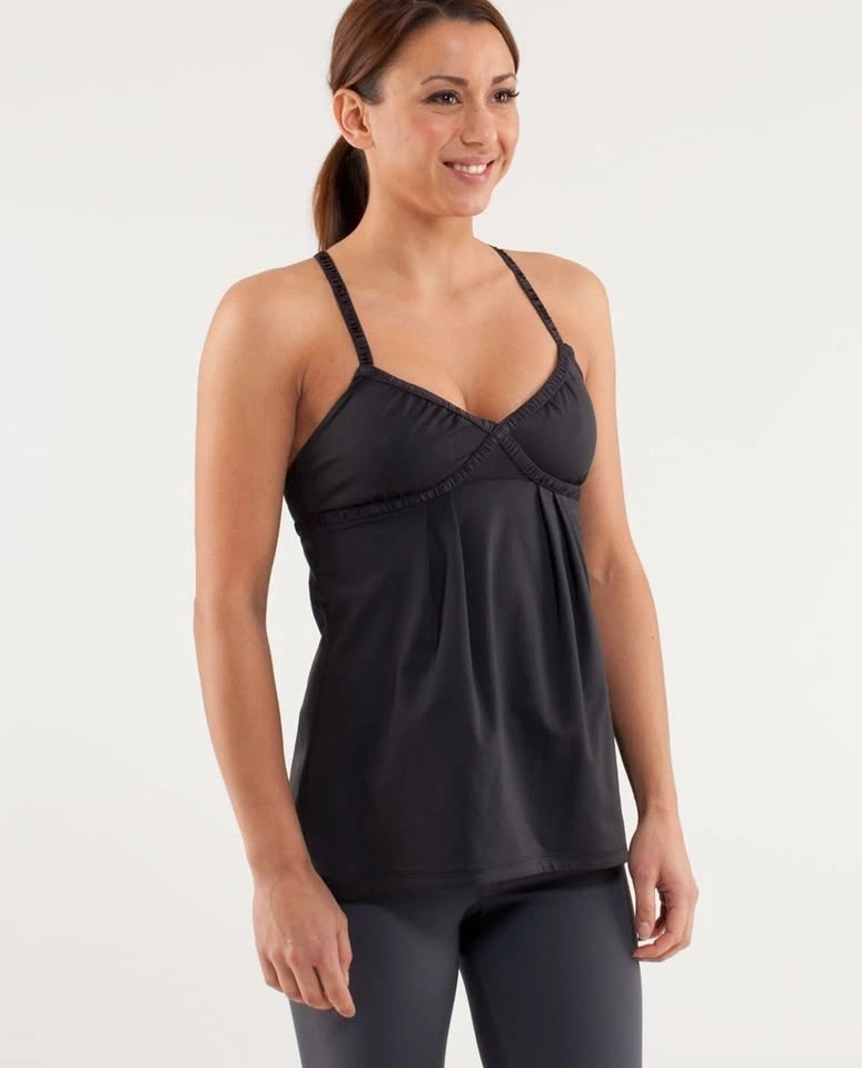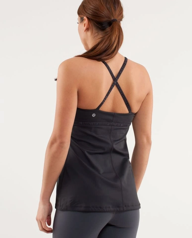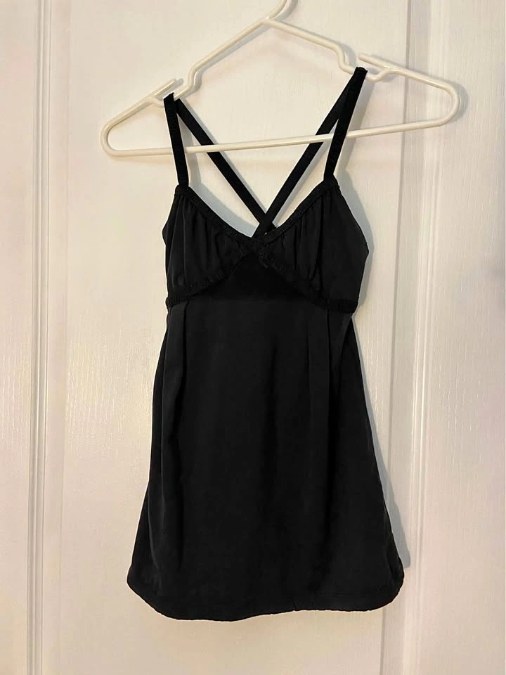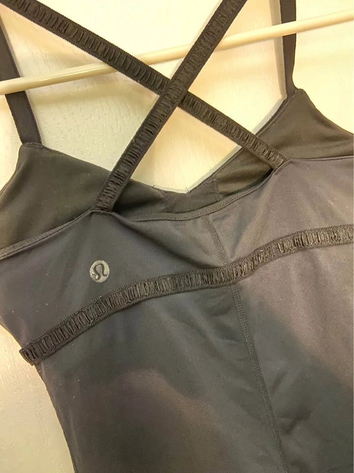 Lululemon Dance Strap Tank Top with crossed elastic straps and a cinchable drawcord at the hem. Colour: Black (logo slightly wearing off). Size 0, fits like an XS. Does not include bra padding. Barely worn. Selling because it is too small for me. Pick up on the North side of St. Thomas.