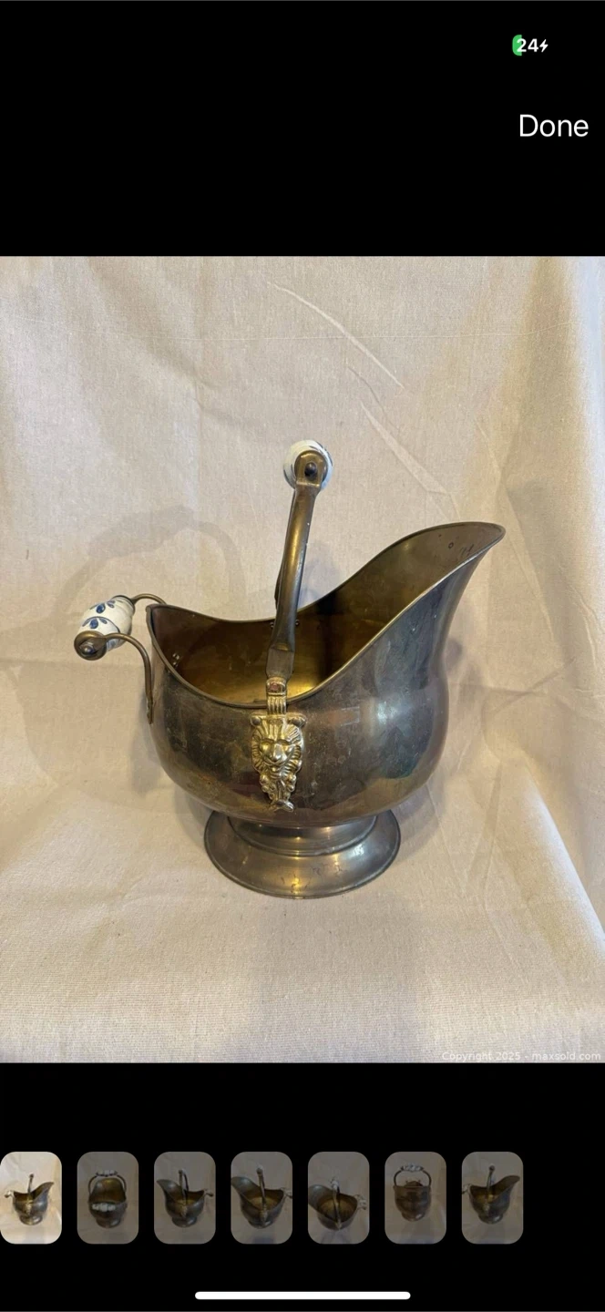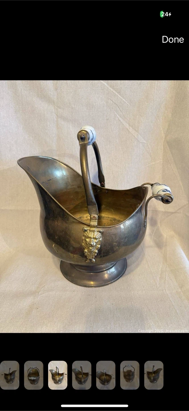 This antique brass coal scuttle features a charming lion's head embossed on the front. It has decorative porcelain handles with blue floral accents. It's perfect for keeping your fireplace tidy and stylish.