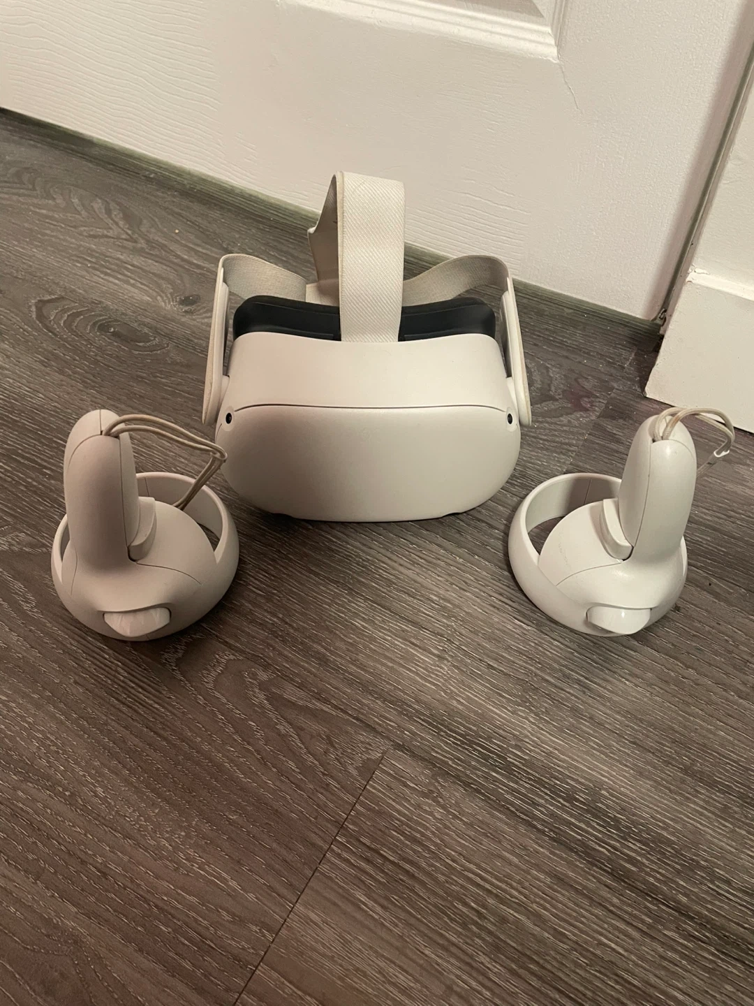This is a Meta Quest 2 virtual reality headset. It comes with two controllers. Experience immersive virtual worlds and games!