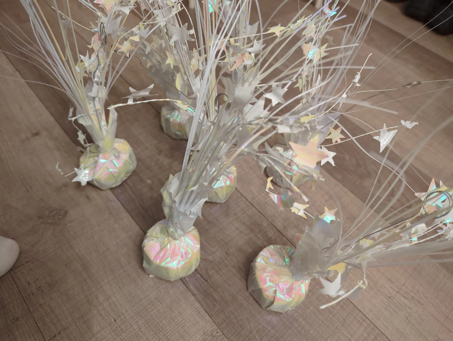 These six Balloon Weight white table centerpieces feature iridescent starbursts. They're great for adding sparkle to any party table! Includes clip for balloons.