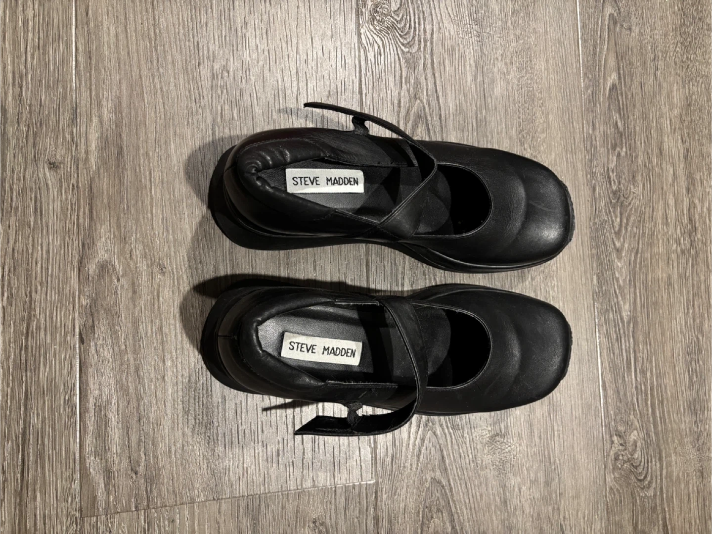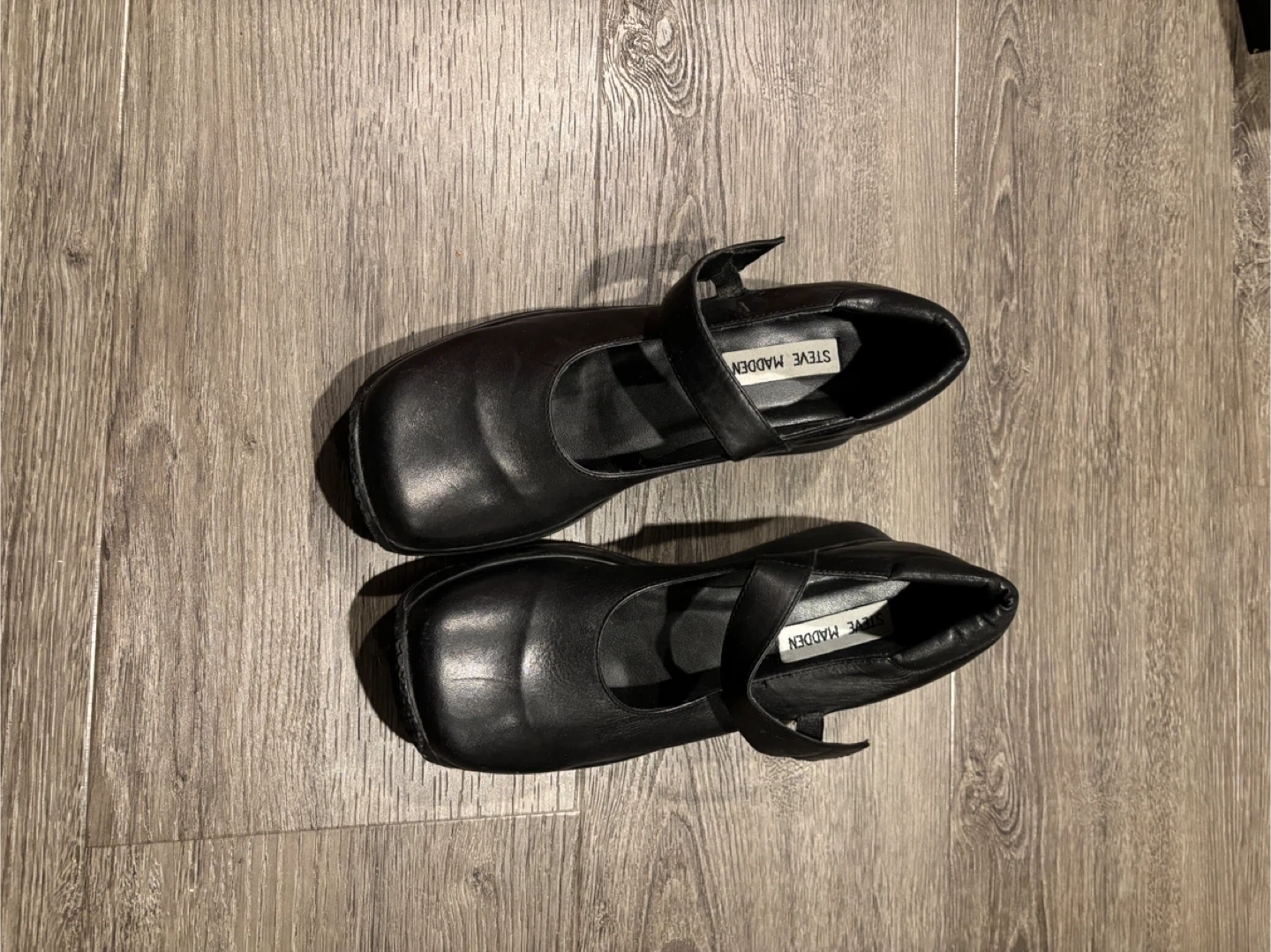 These are Steve Madden Mary Jane shoes. The shoes are black and made of leather. They're a size 8.5.