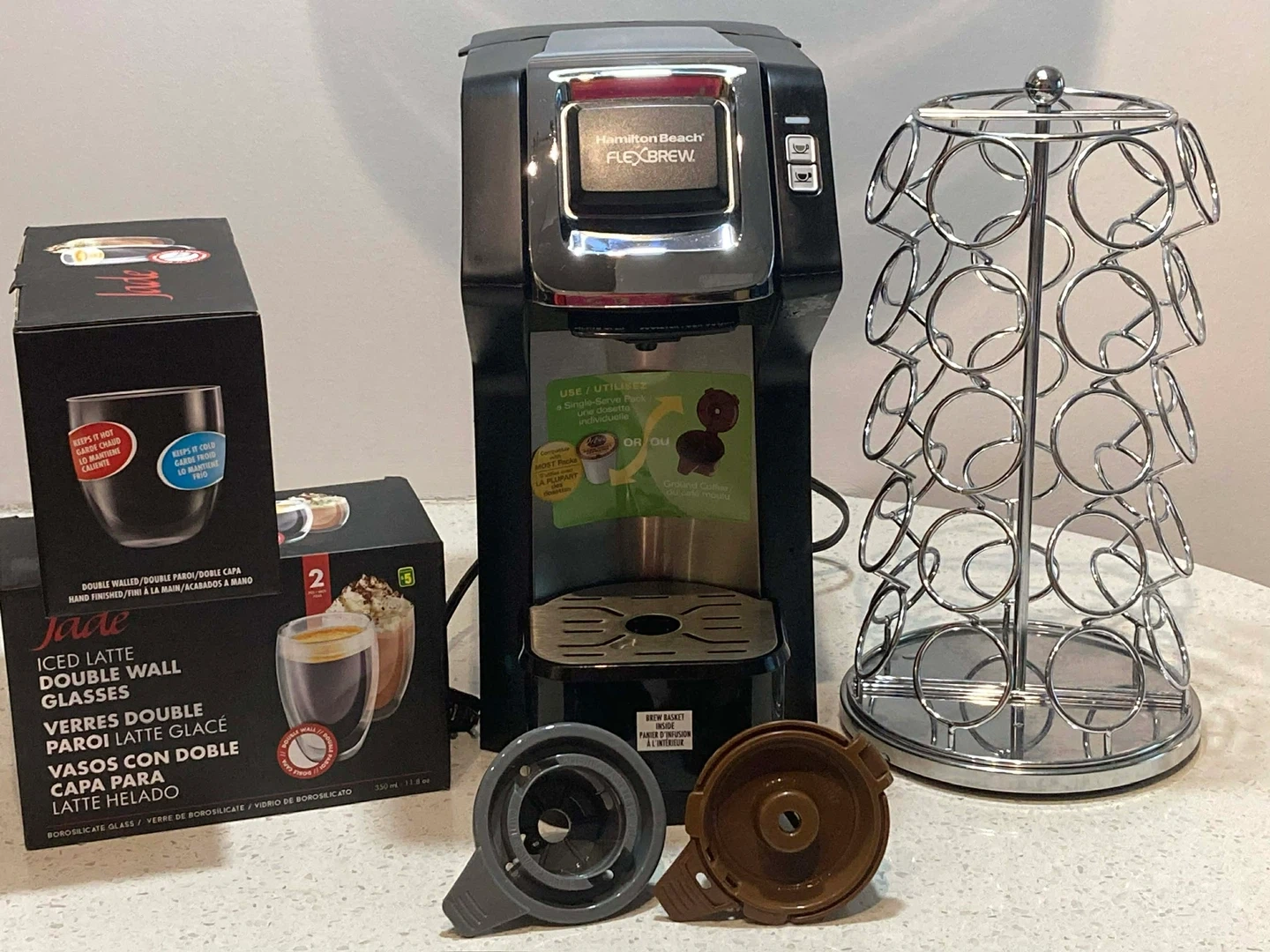 This Hamilton Beach FlexBrew coffee maker brews single-serve K-cup pods or ground coffee. It also includes a K-cup pod holder for convenient storage. Two Jade double-wall borosilicate glass glasses are also included.