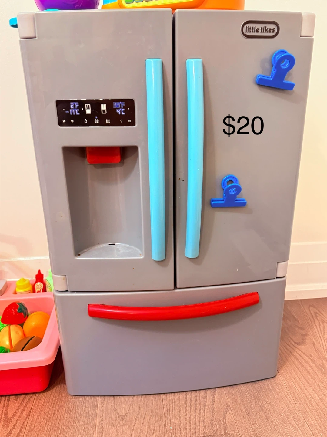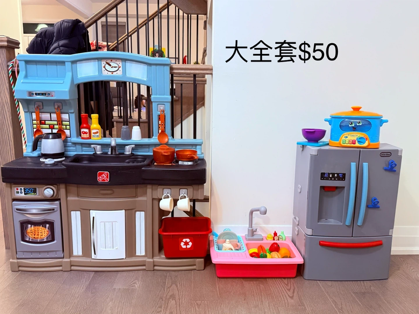 This is a play kitchen set from Step2 and a fridge from Little Tikes. It comes with various accessories for pretend play. Great for developing kids' imagination!