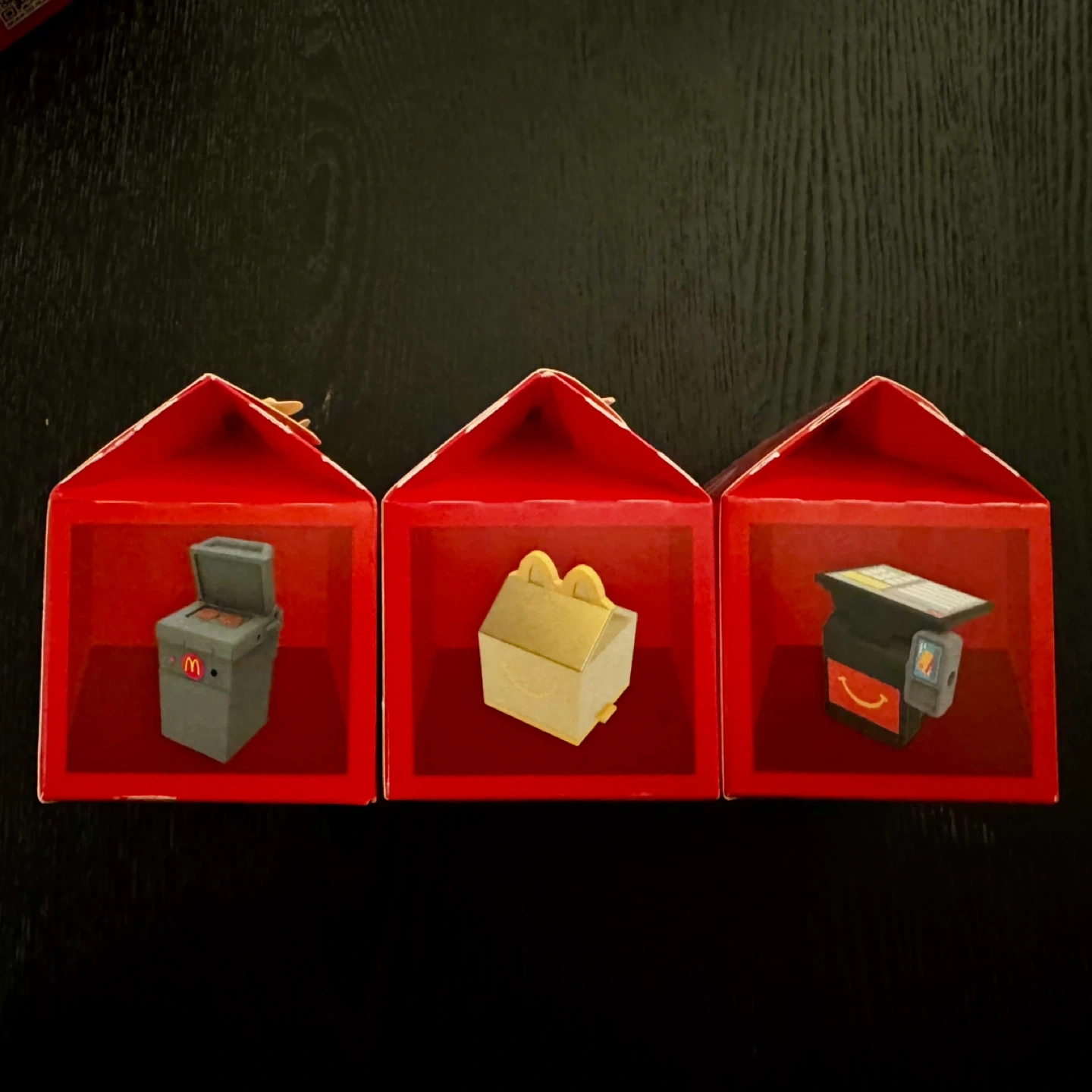 Three miniature collectibles from McDonald's Happy Meals. They represent a grill, a Happy Meal box, and a cash register. Great for collectors or kids!