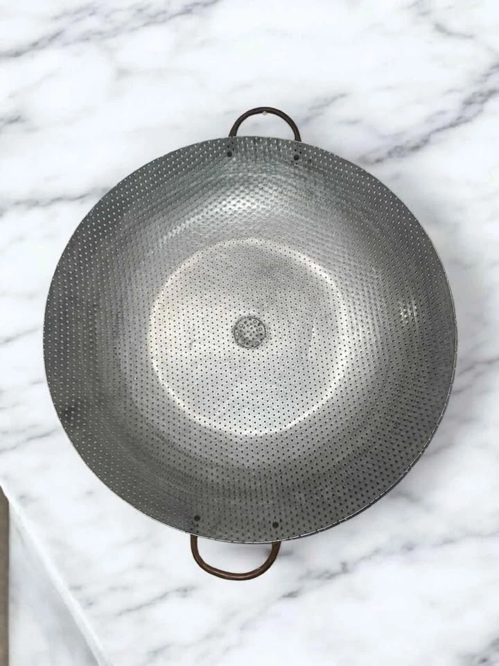 Extra large, 25-inch round strainer with two handles, 4 inches deep. Perforated aluminum, often used as a colander or sieve for cooking and canning. Also similar to a perforated steam table pan for draining and steaming food.