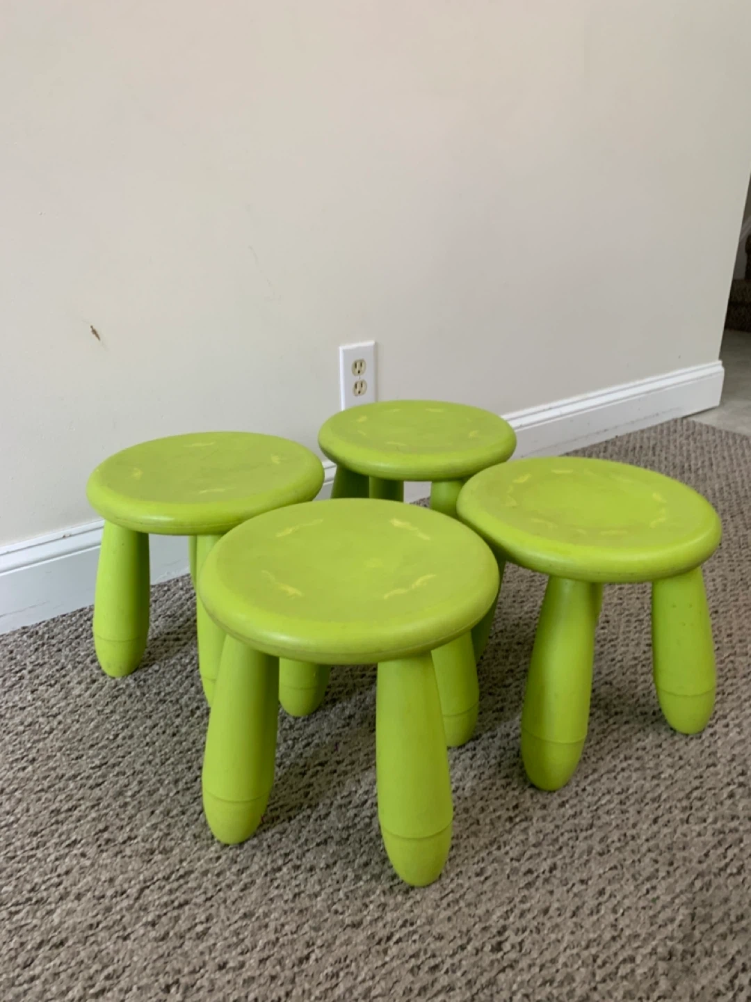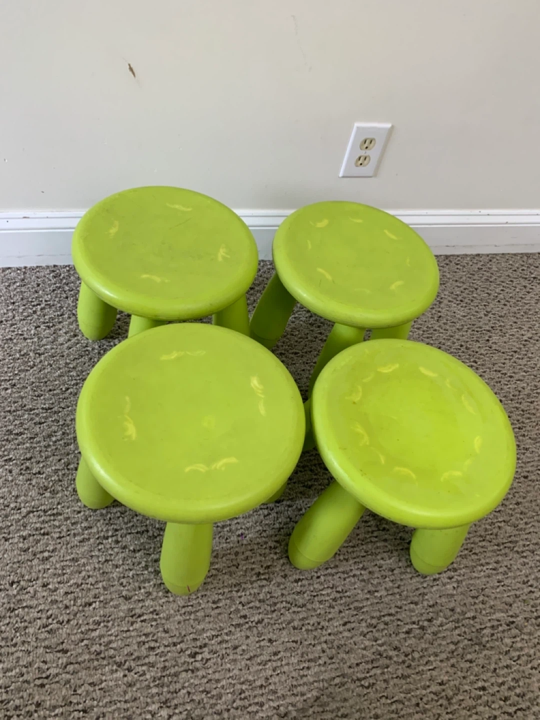 These are four green IKEA children's stools. They're made of plastic and are great for little ones to sit on or use as a step. They're super handy for kids' rooms or play areas!