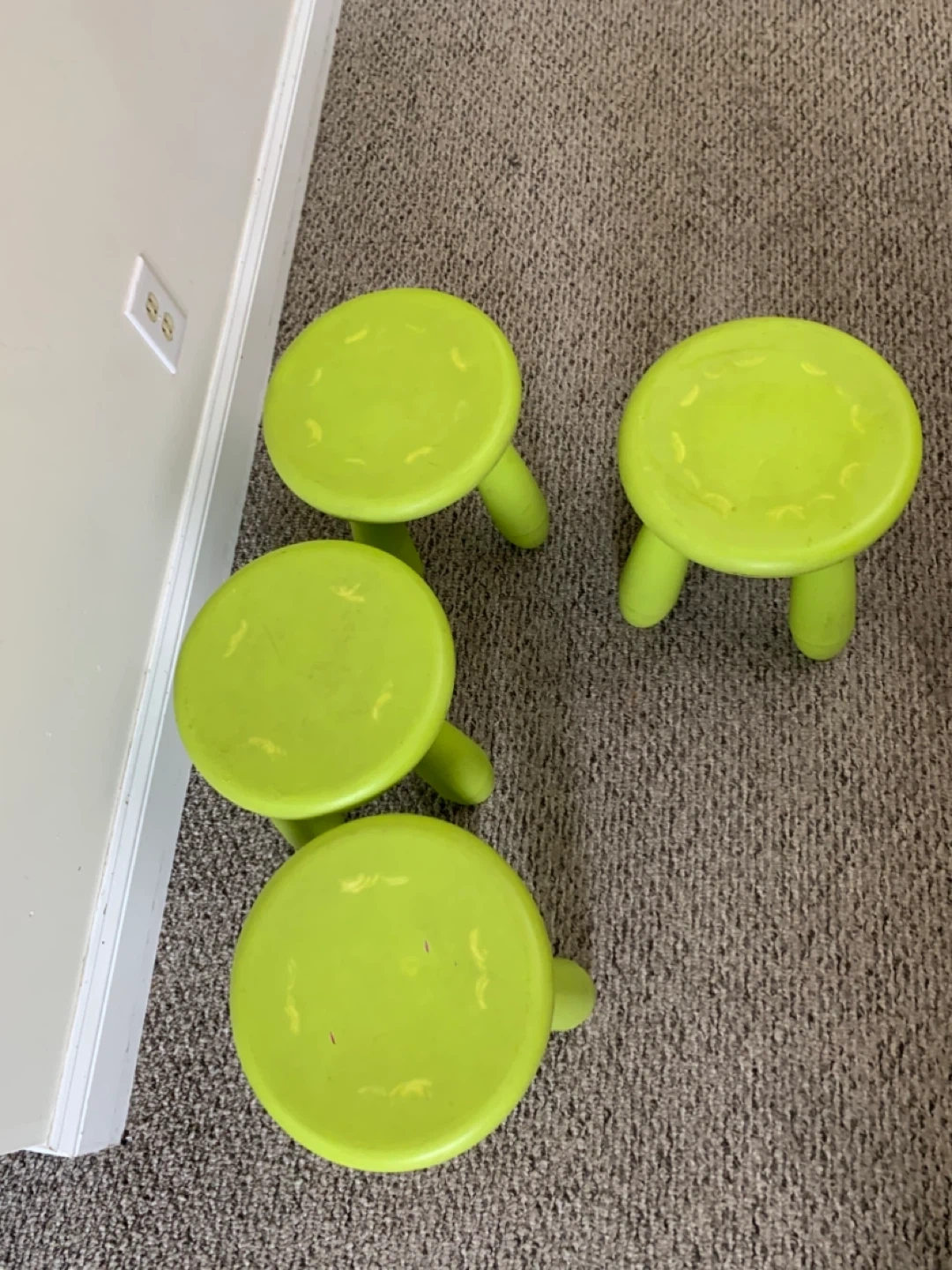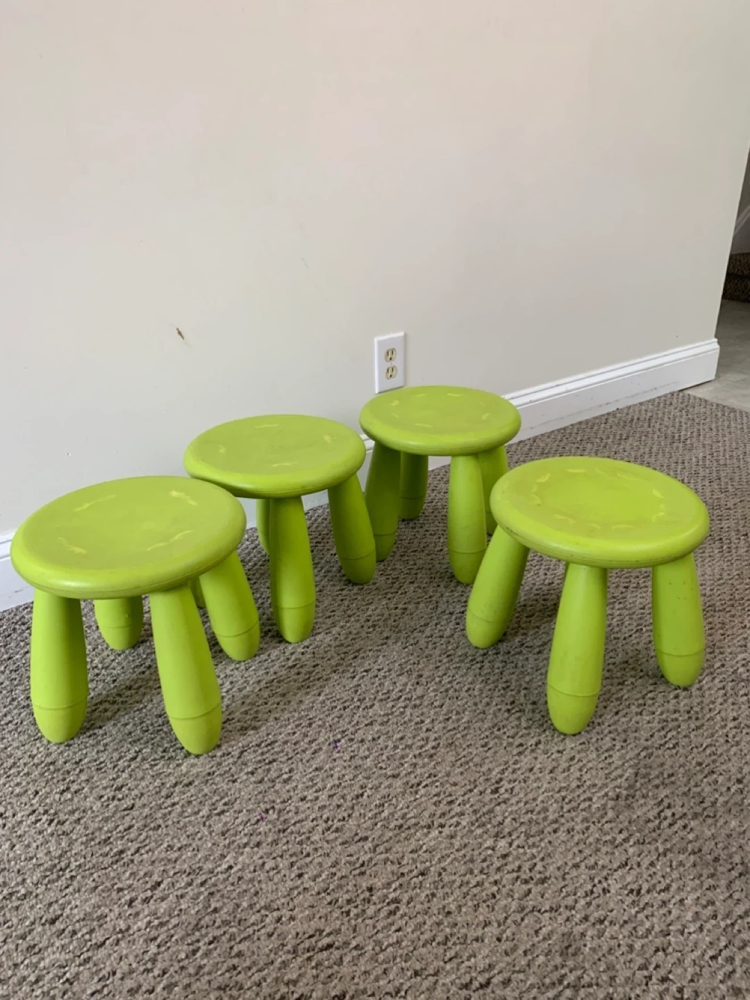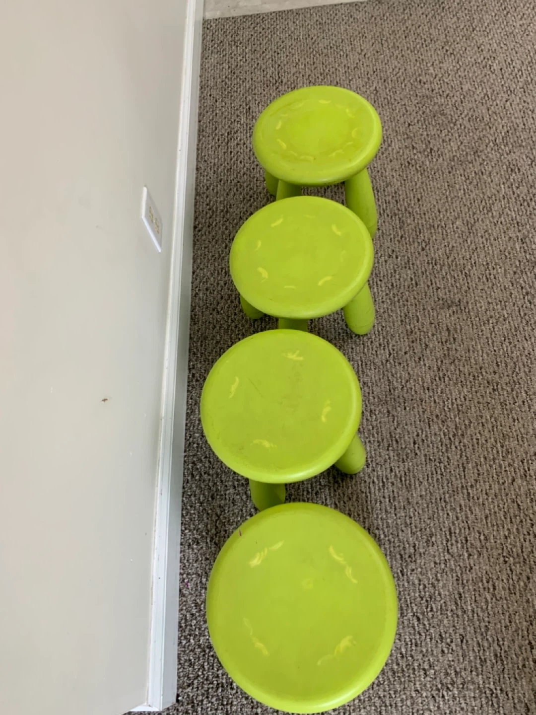 These are four green IKEA children's stools. They're made of plastic and are great for little ones to sit on or use as a step. They're super handy for kids' rooms or play areas!