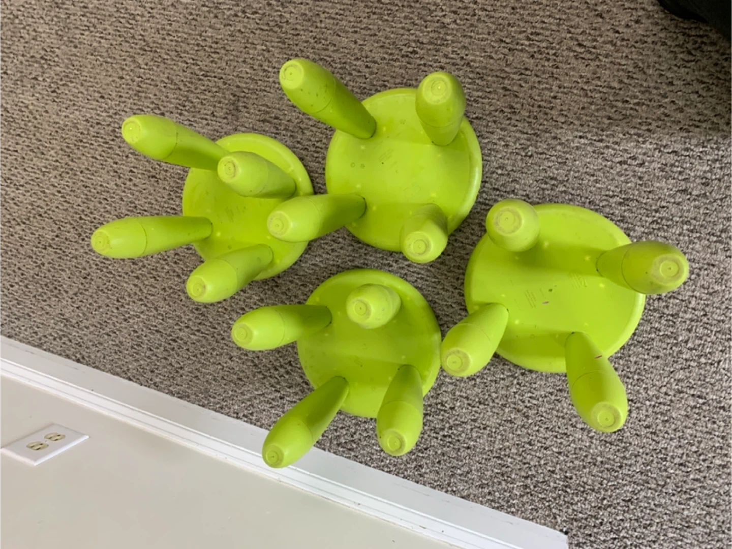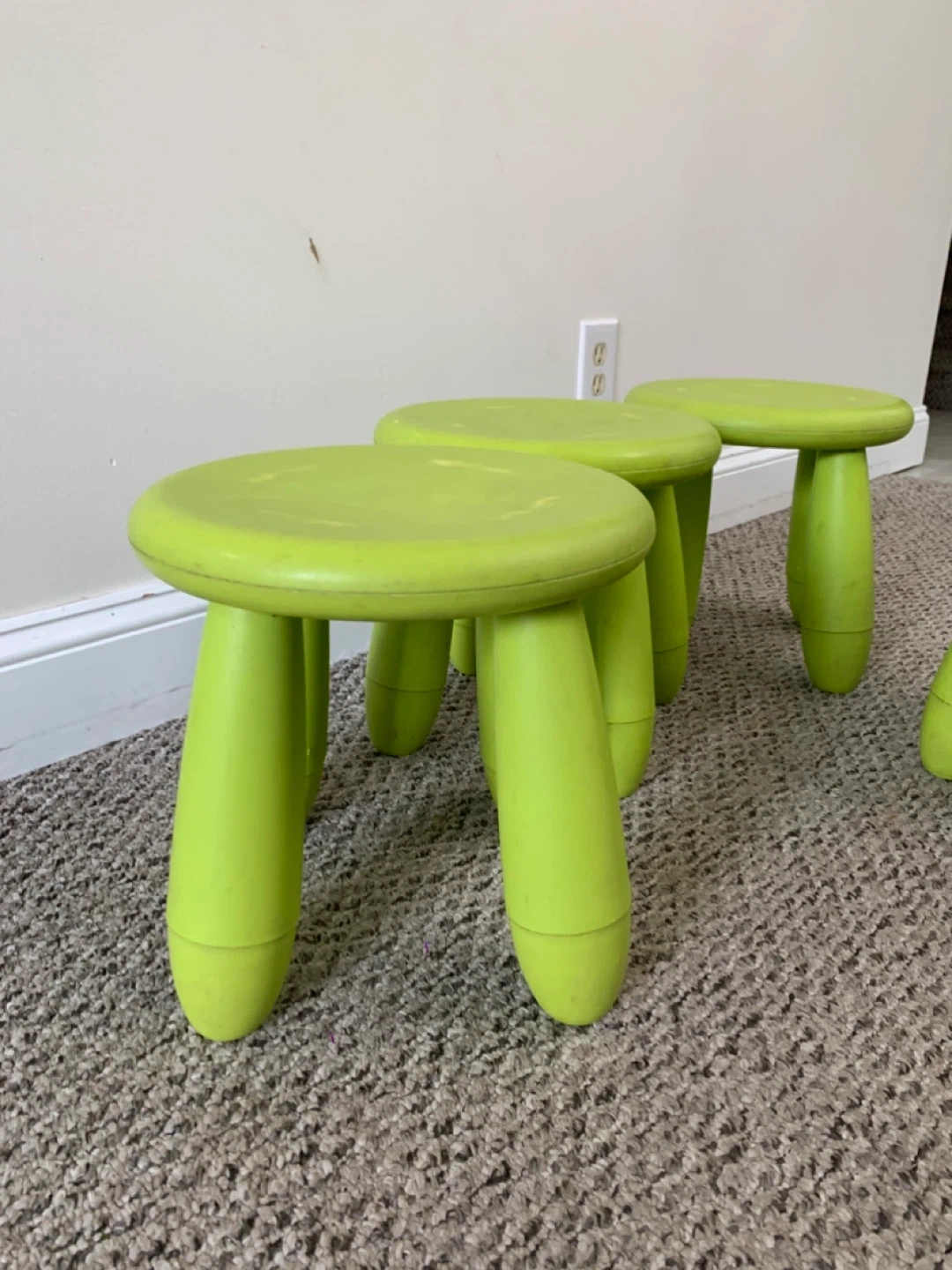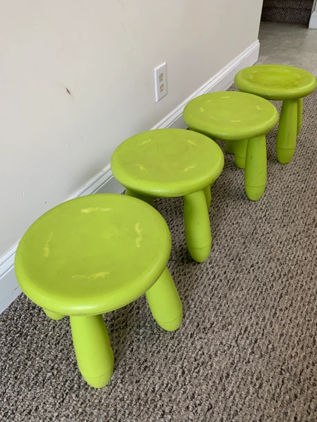 These are four green IKEA children's stools. They're made of plastic and are great for little ones to sit on or use as a step. They're super handy for kids' rooms or play areas!