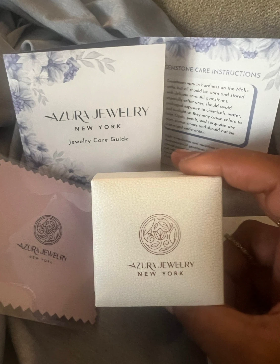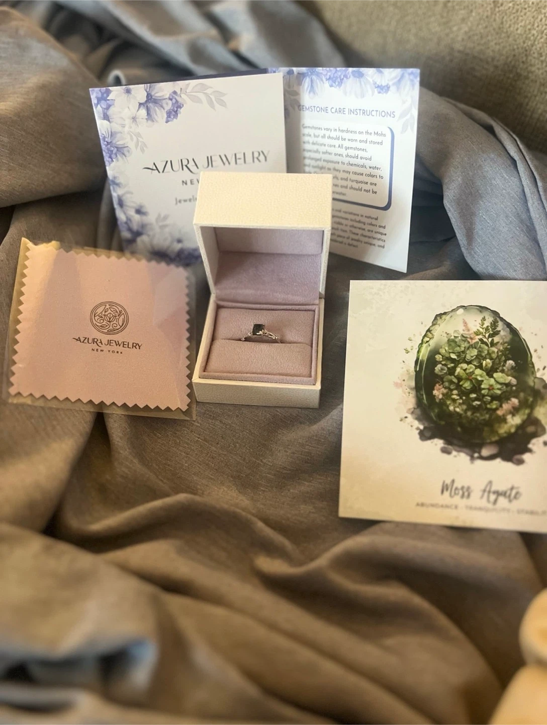 10K White Gold ring featuring a rectangular moss agate gemstone. It comes with the original Azura Jewelry New York box, a jewelry care guide, and a polishing cloth. This ring showcases a unique, natural stone.