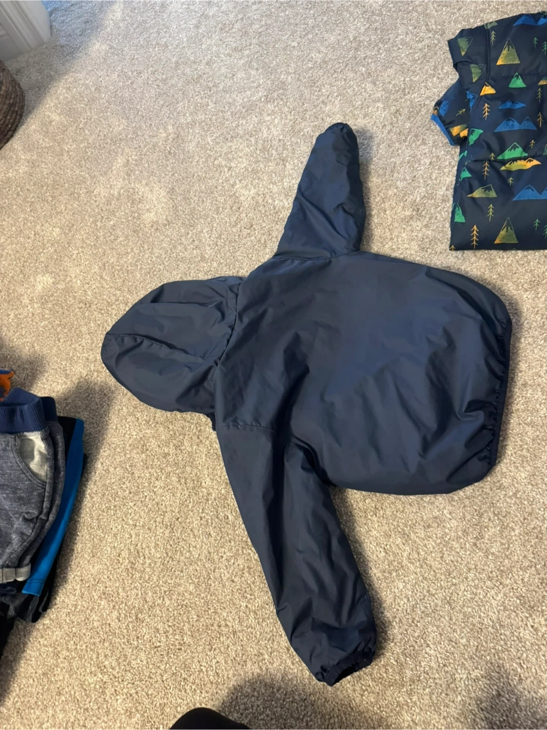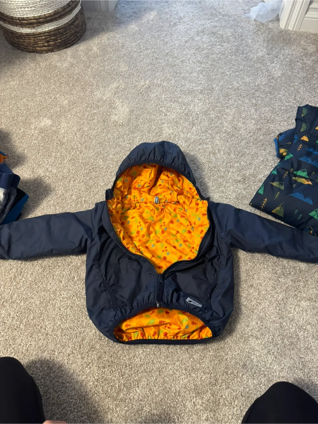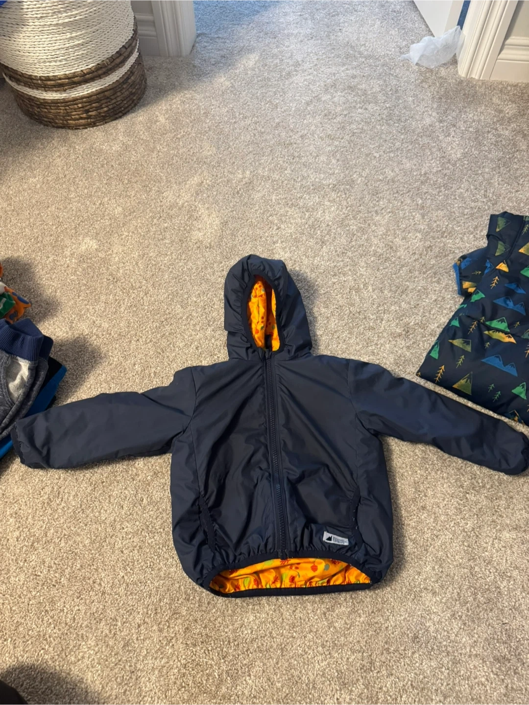 This is a kids' reversible jacket, one side is a solid navy blue and the other is a bright orange with a fun pattern. It's a great layer for cooler days. The jacket has a hood and a full zip closure.