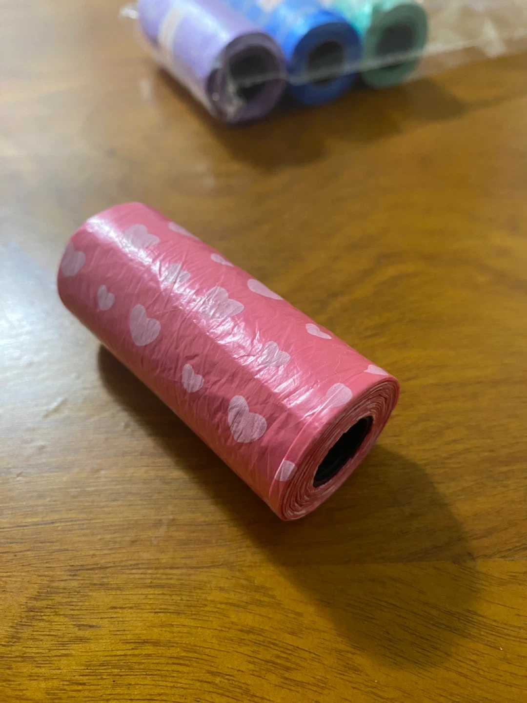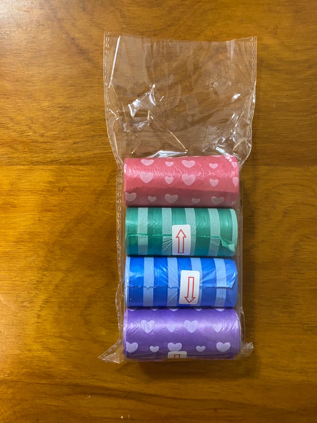 I’m selling a set of 4 rolls of dog waste bags in mixed colours/patterns (see photo).