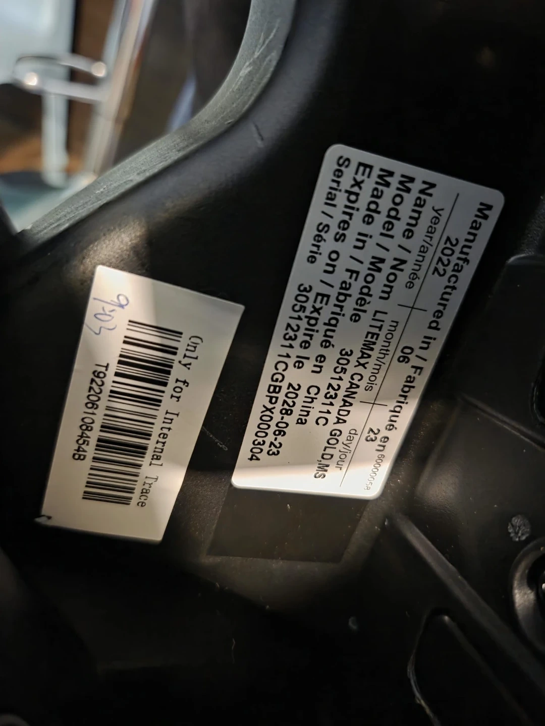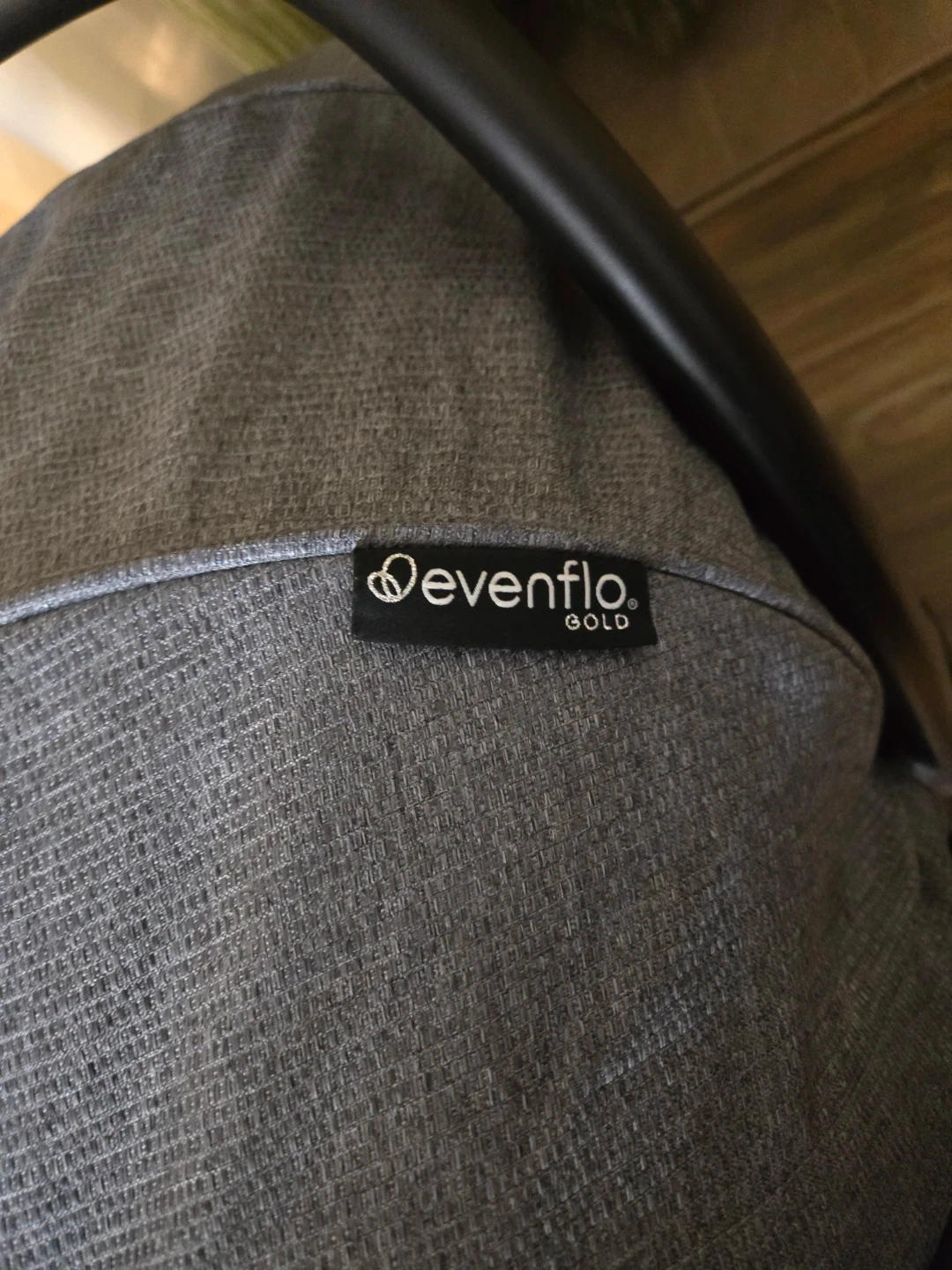 Evenflo LiteMax infant car seat in grey. Manufactured in 2022 and expires on 2028-06-23. Designed for rear-facing use with children weighing between 4 and 35 lbs. Harness is adjustable for a snug fit.