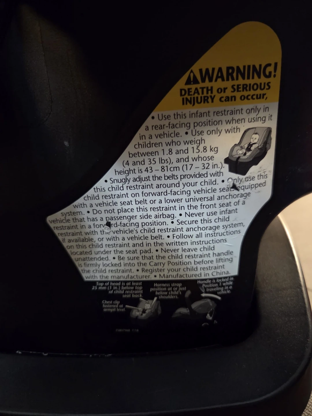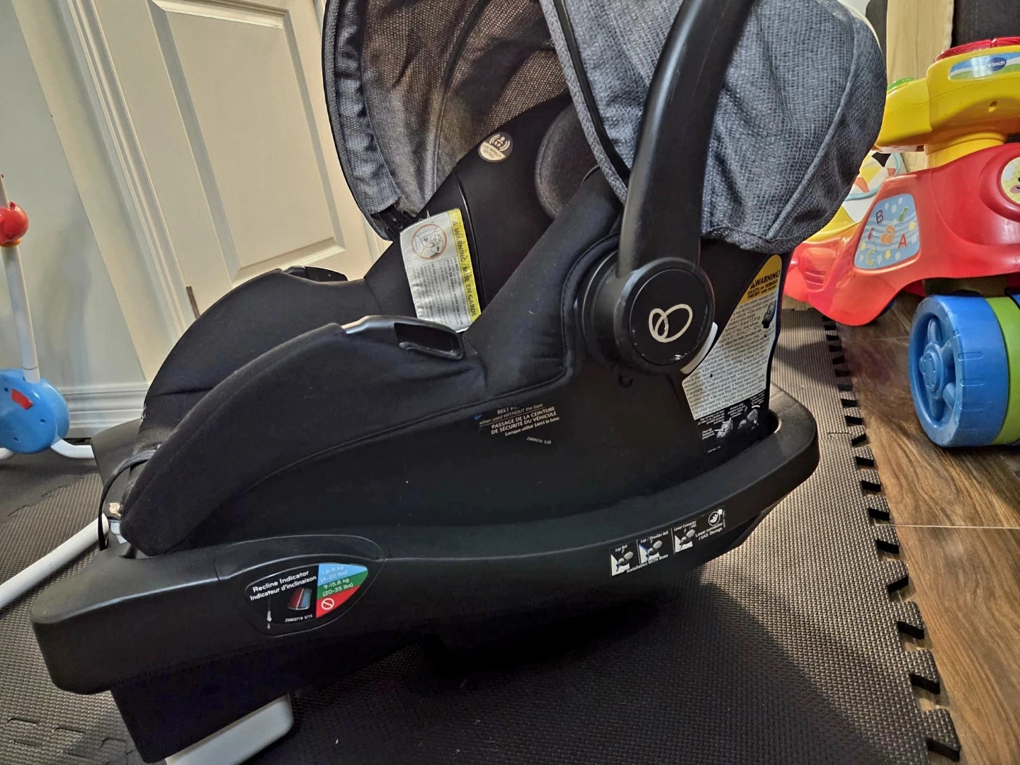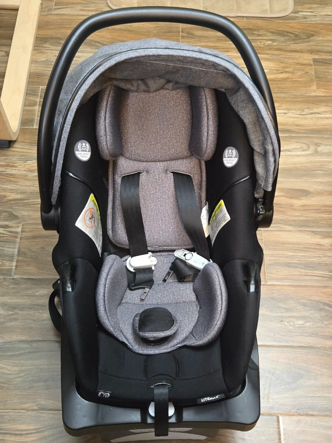 Evenflo LiteMax infant car seat in grey. Manufactured in 2022 and expires on 2028-06-23. Designed for rear-facing use with children weighing between 4 and 35 lbs. Harness is adjustable for a snug fit.