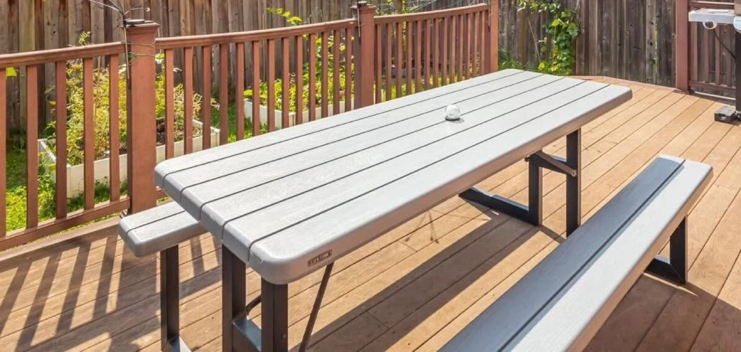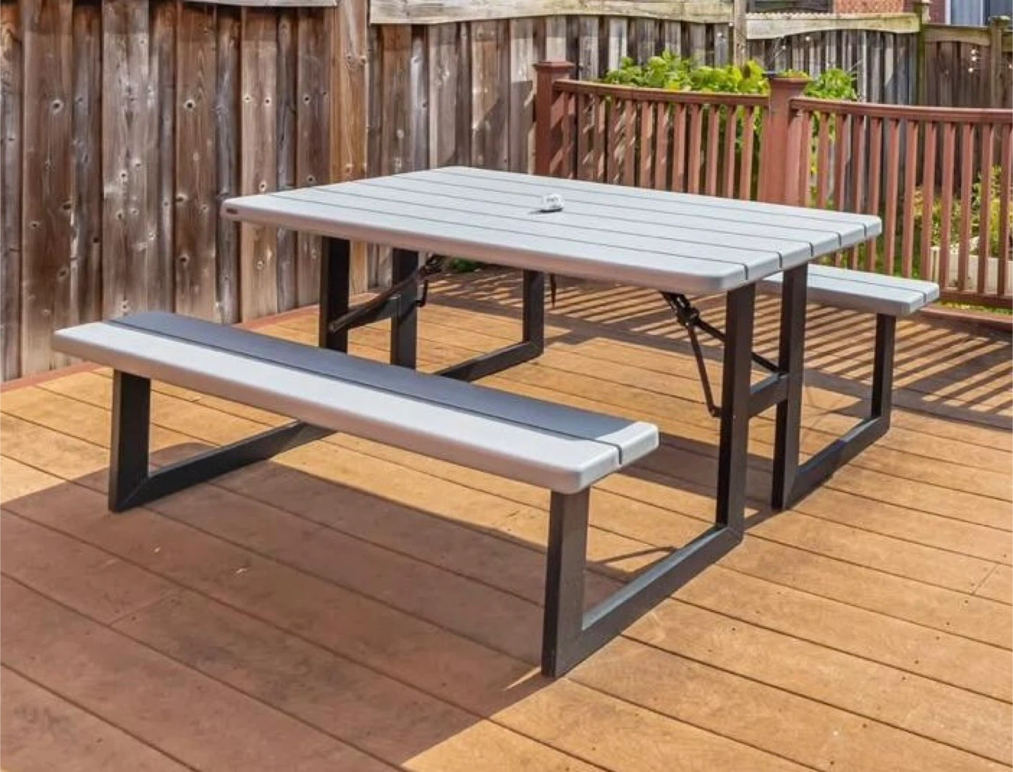 This Lifetime 6 feet wide picnic table with attached benches is made of grey plastic and metal. It's a convenient outdoor seating solution.