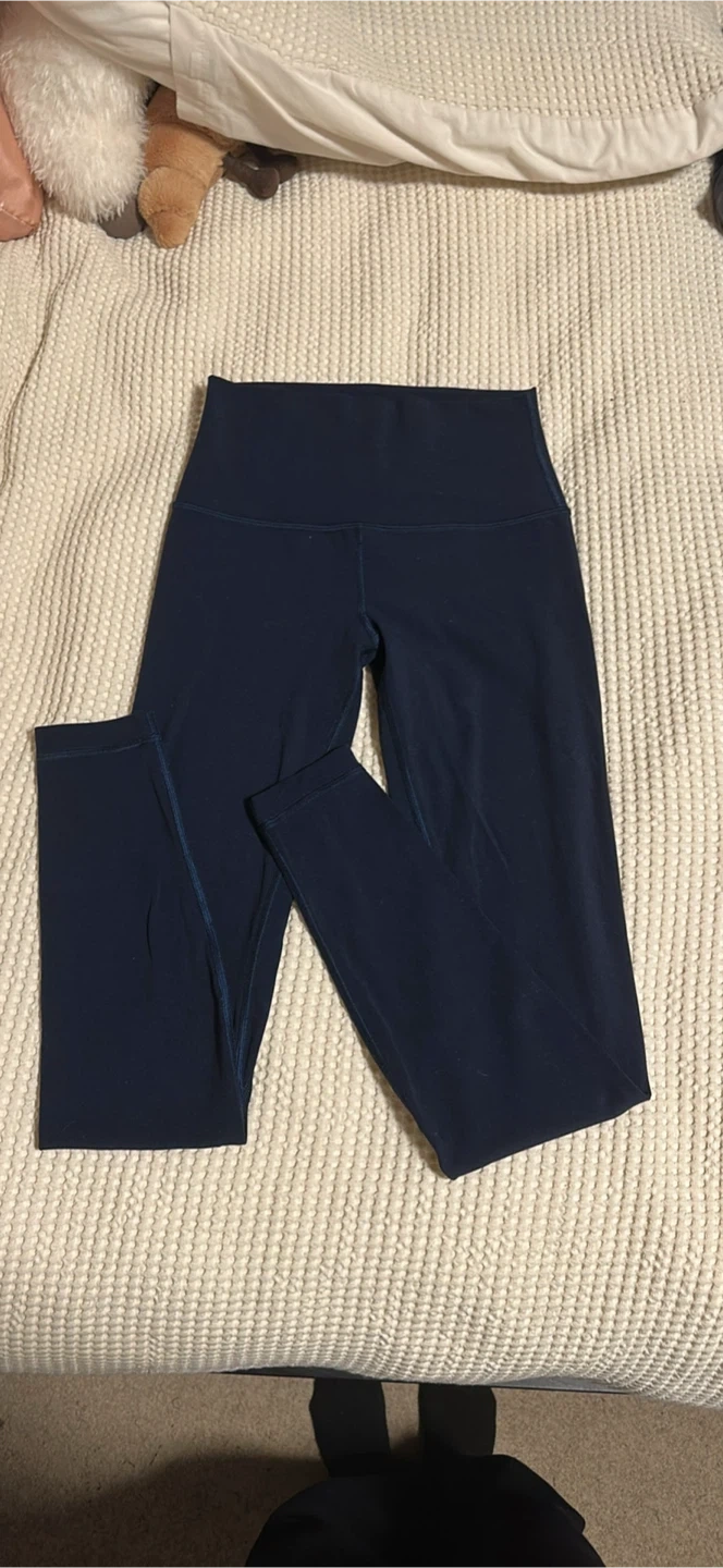 Navy blue Lululemon leggings, size 4. These are designed for yoga and are made with a comfortable, stretchy material. They're perfect for workouts or everyday wear!