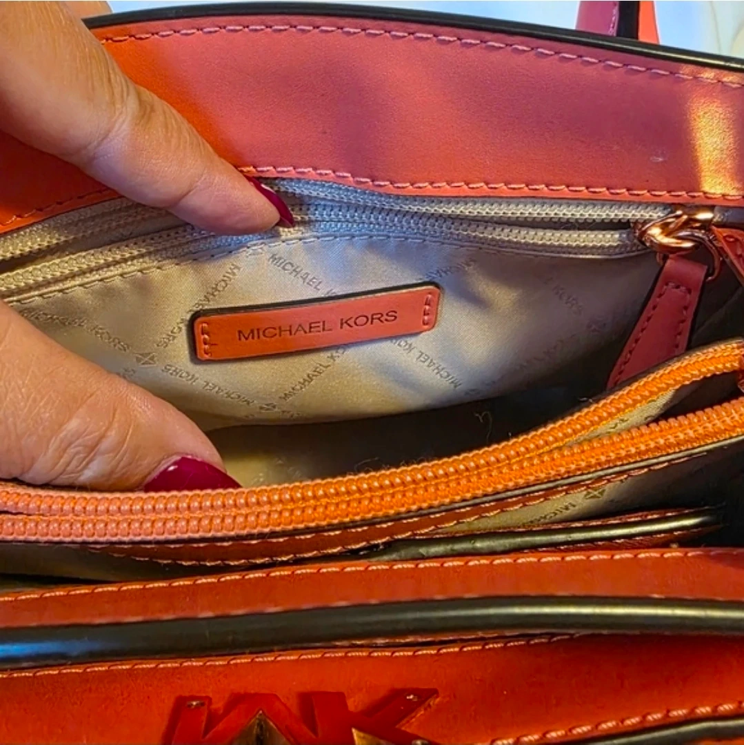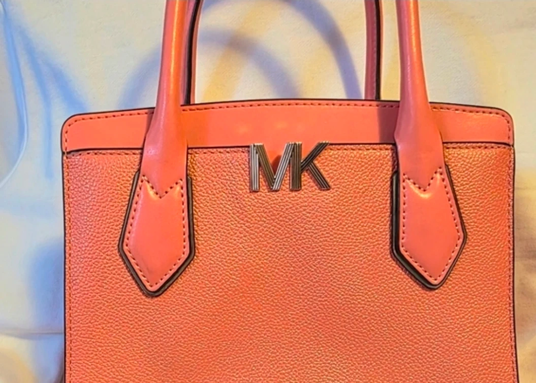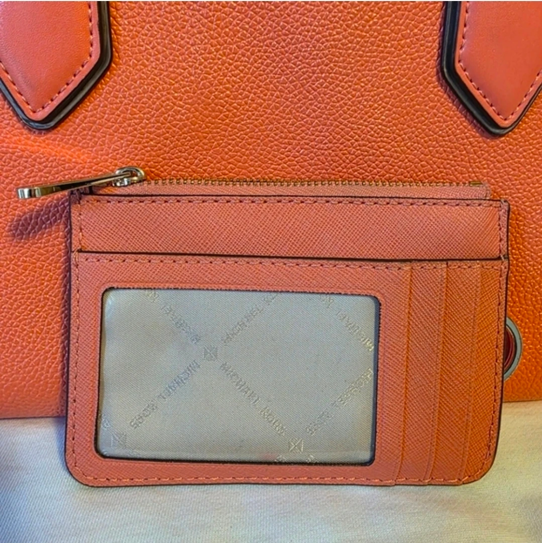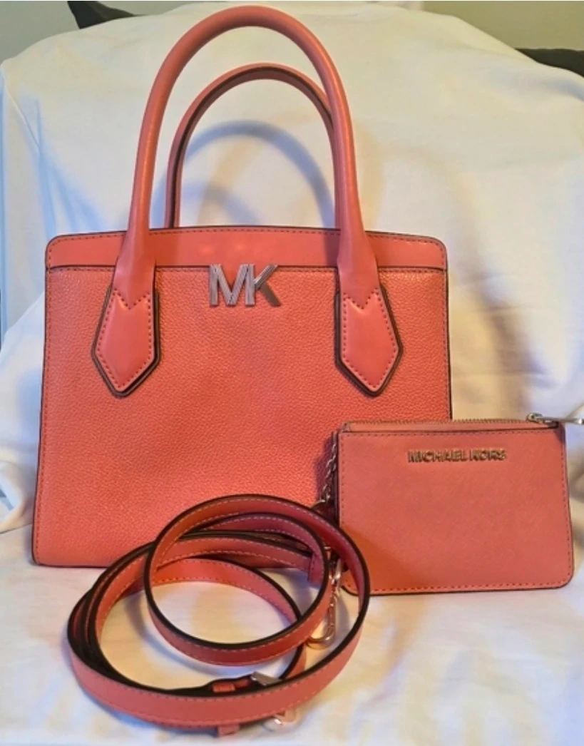 Coral/peach Michael Kors pebbled leather satchel with matching wallet. Features elegant design and sturdy handles.