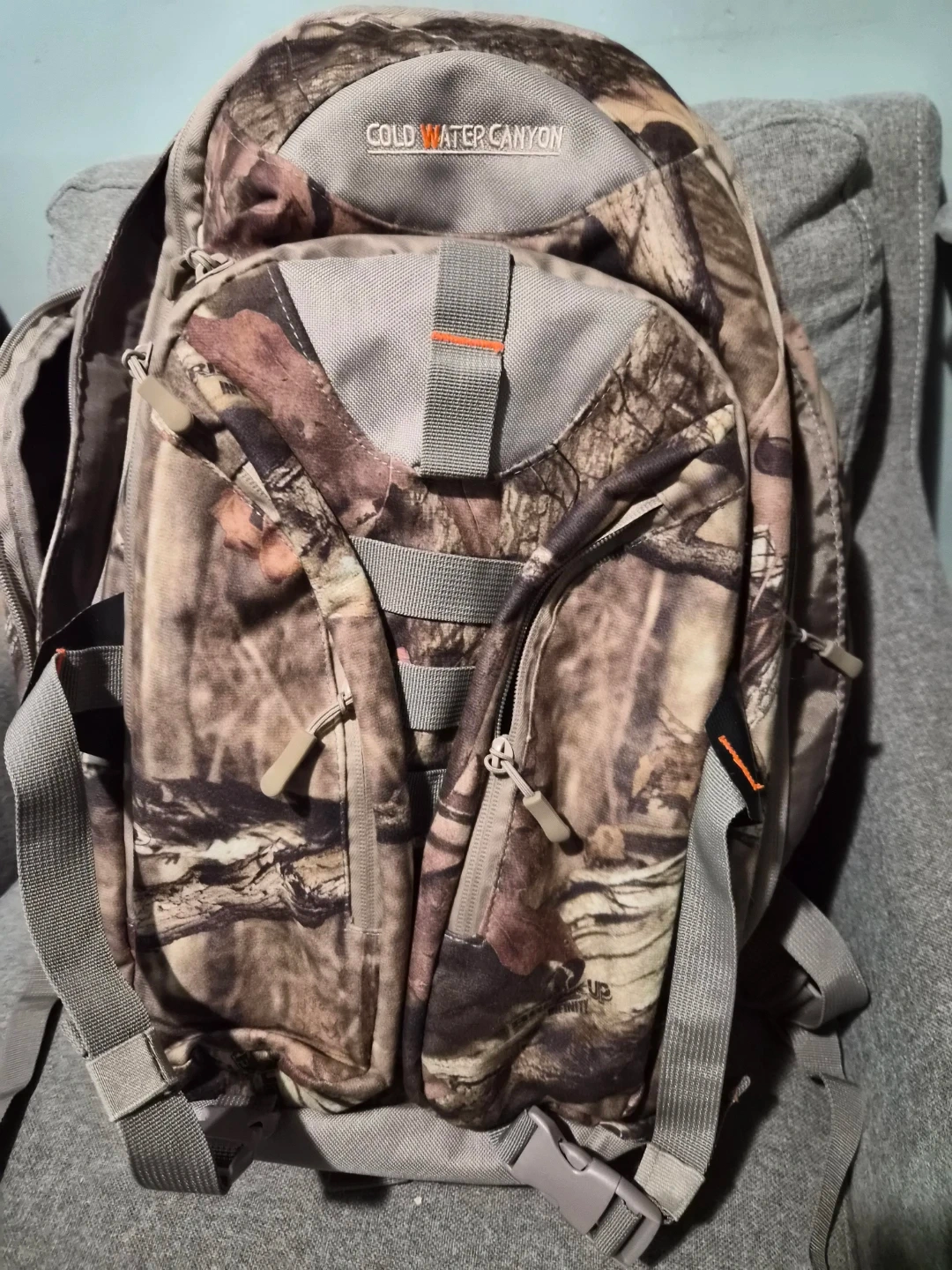 This is a Cold Water Canyon backpack with a camouflage pattern. It features multiple zippered pockets and adjustable shoulder straps. It's great for outdoor activities!
