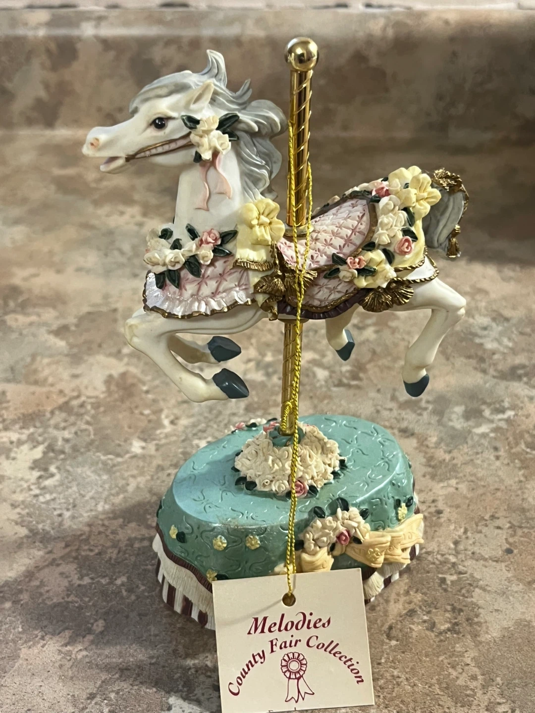 This decorative carousel horse is from the County Fair Collection's Melodies line. It's adorned with floral details on its saddle and base. A charming piece for display!