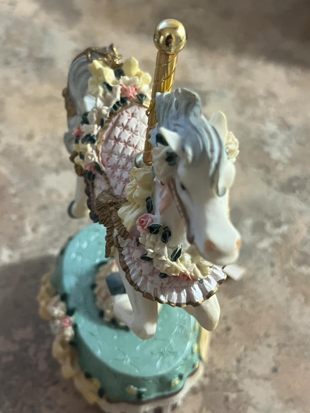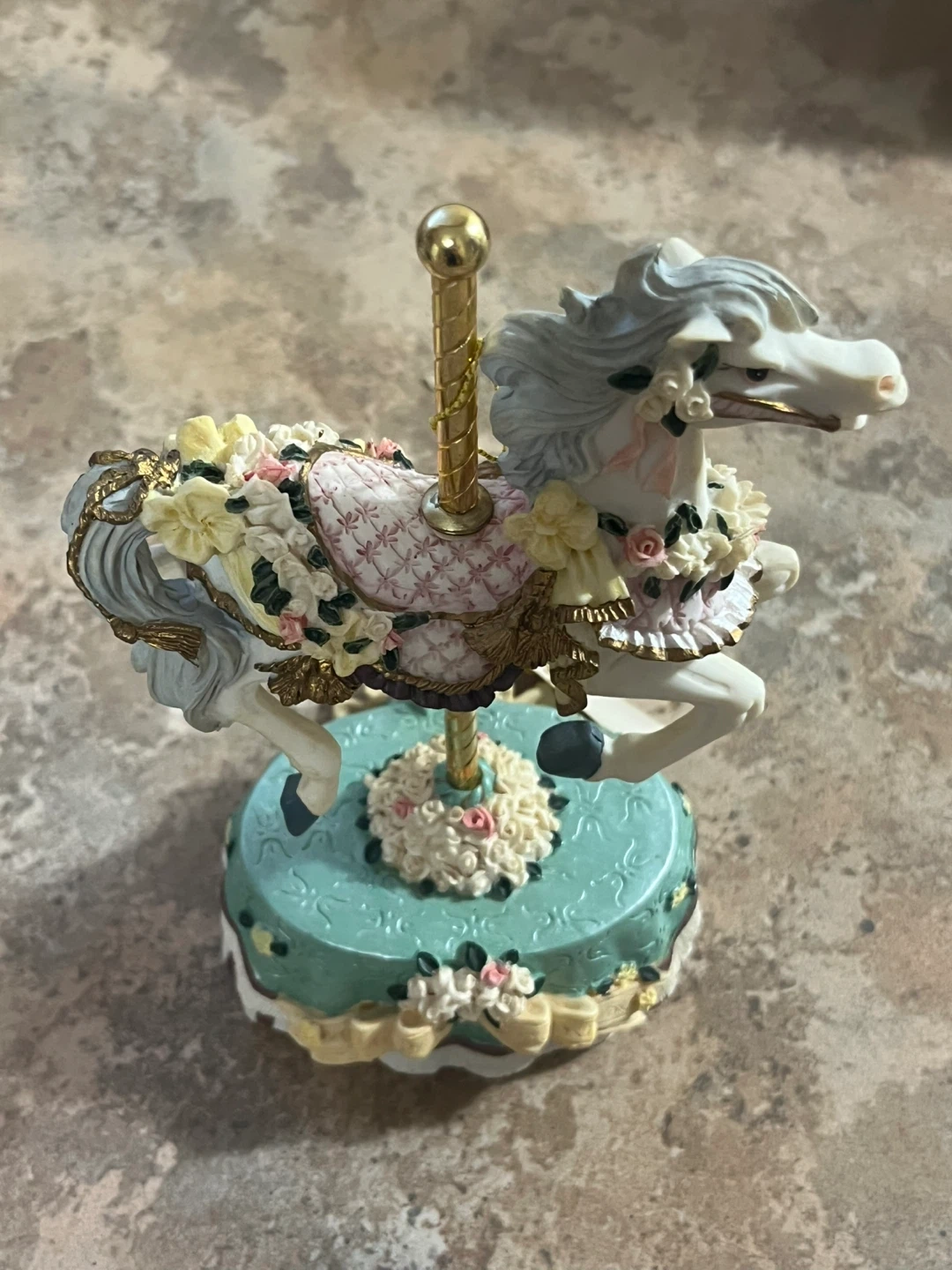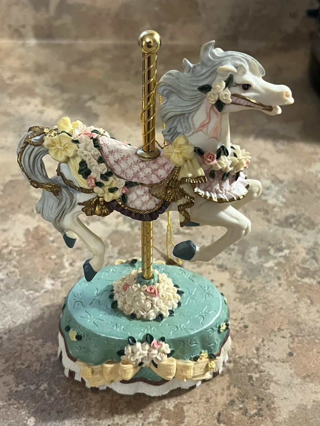 This decorative carousel horse is from the County Fair Collection's Melodies line. It's adorned with floral details on its saddle and base. A charming piece for display!