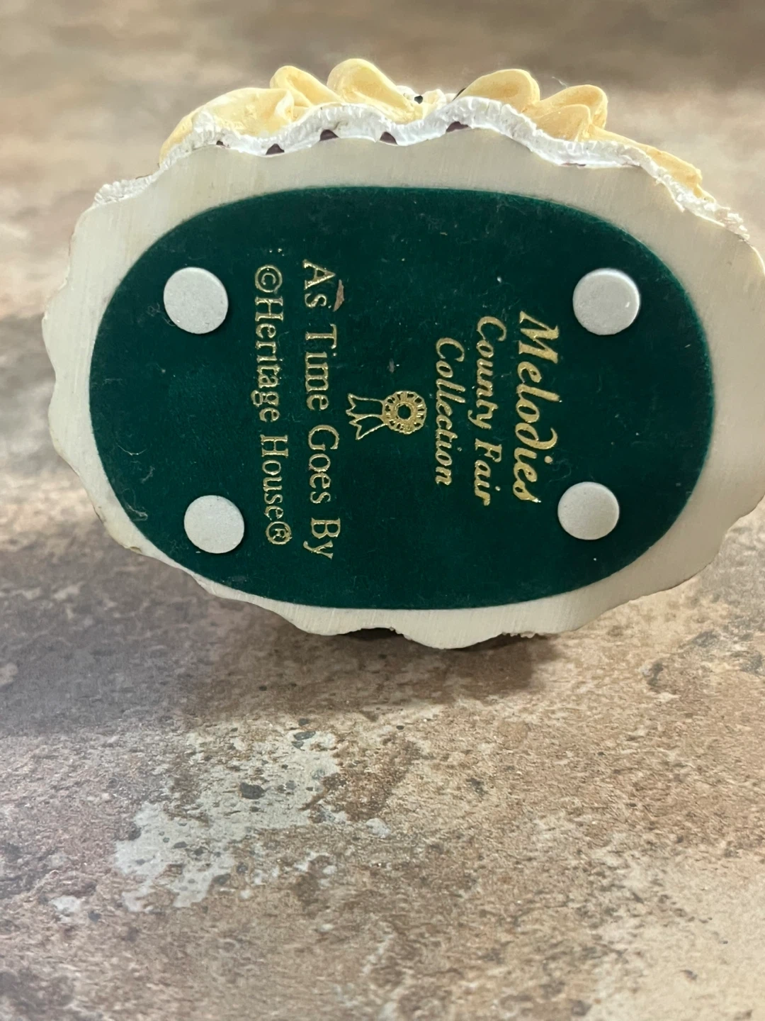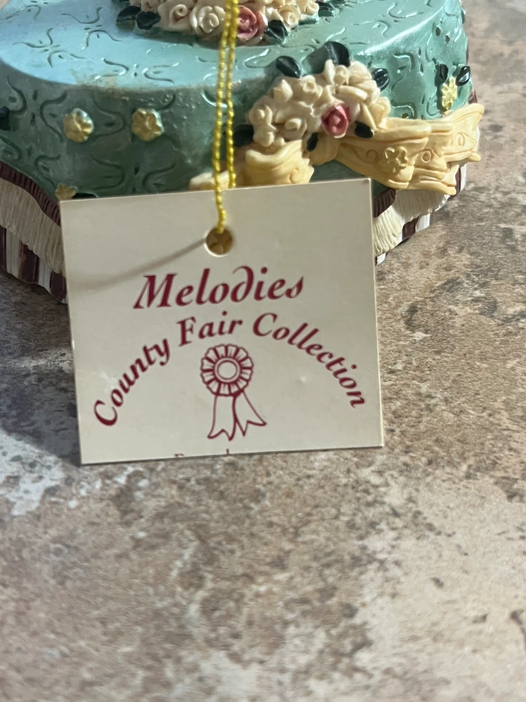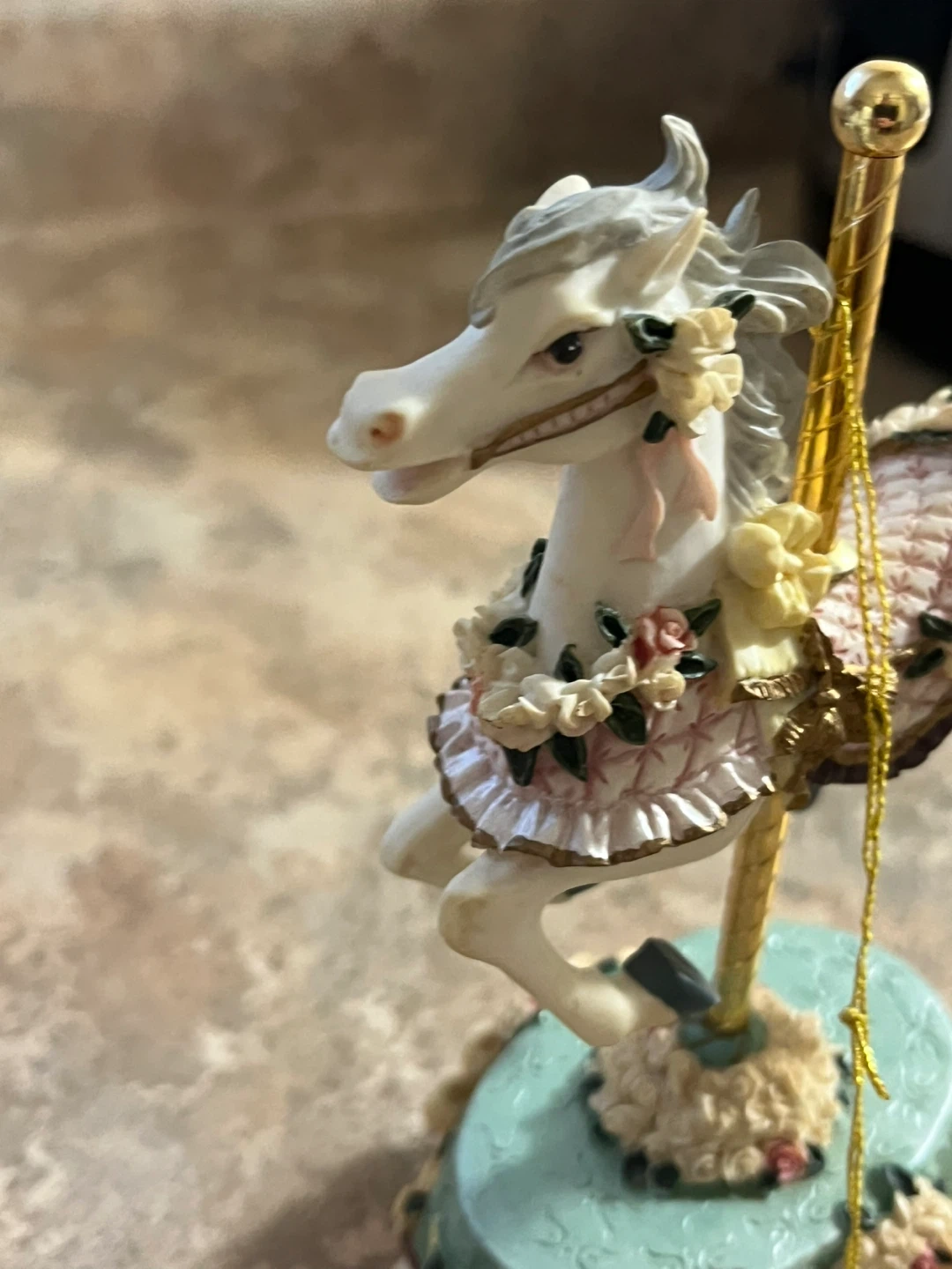 This decorative carousel horse is from the County Fair Collection's Melodies line. It's adorned with floral details on its saddle and base. A charming piece for display!