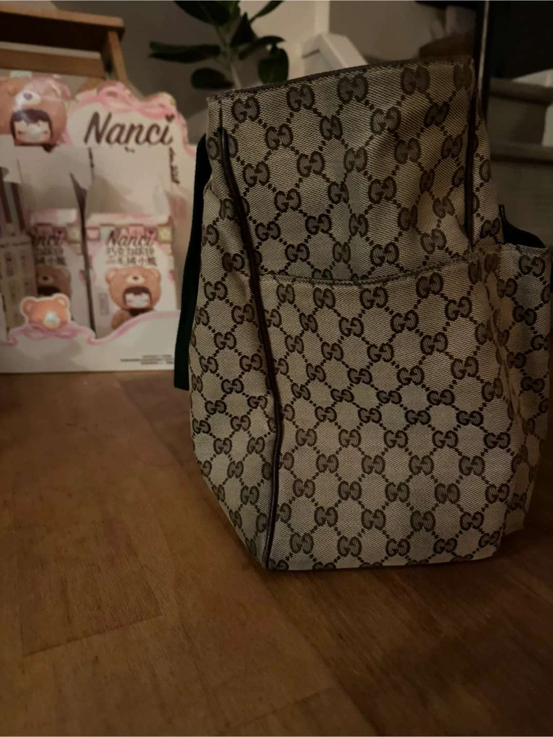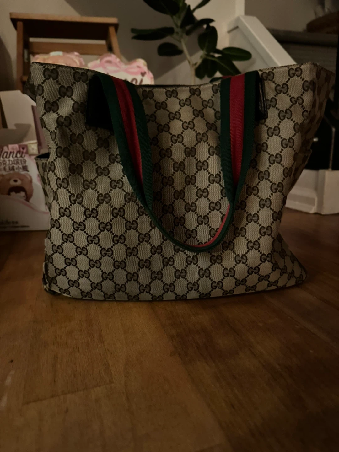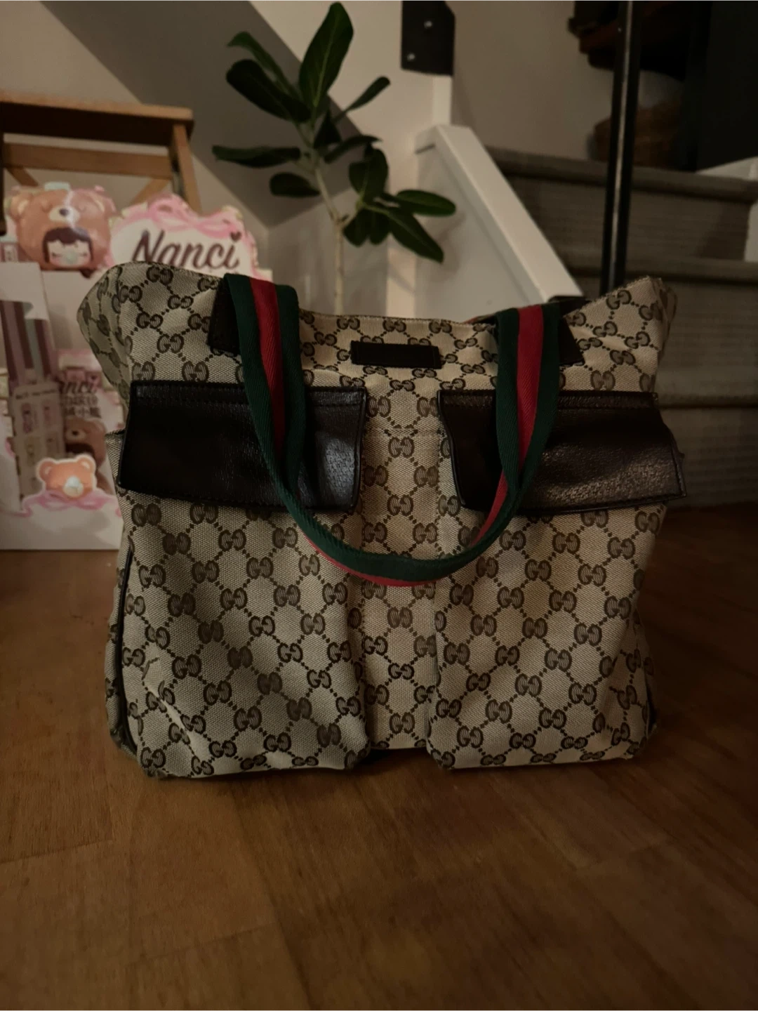 Authentic vintage Gucci tote back with red & green canvas straps from Y2K Tom Ford Era. GG canvas, eather pocket detail and magnetic snap closure.