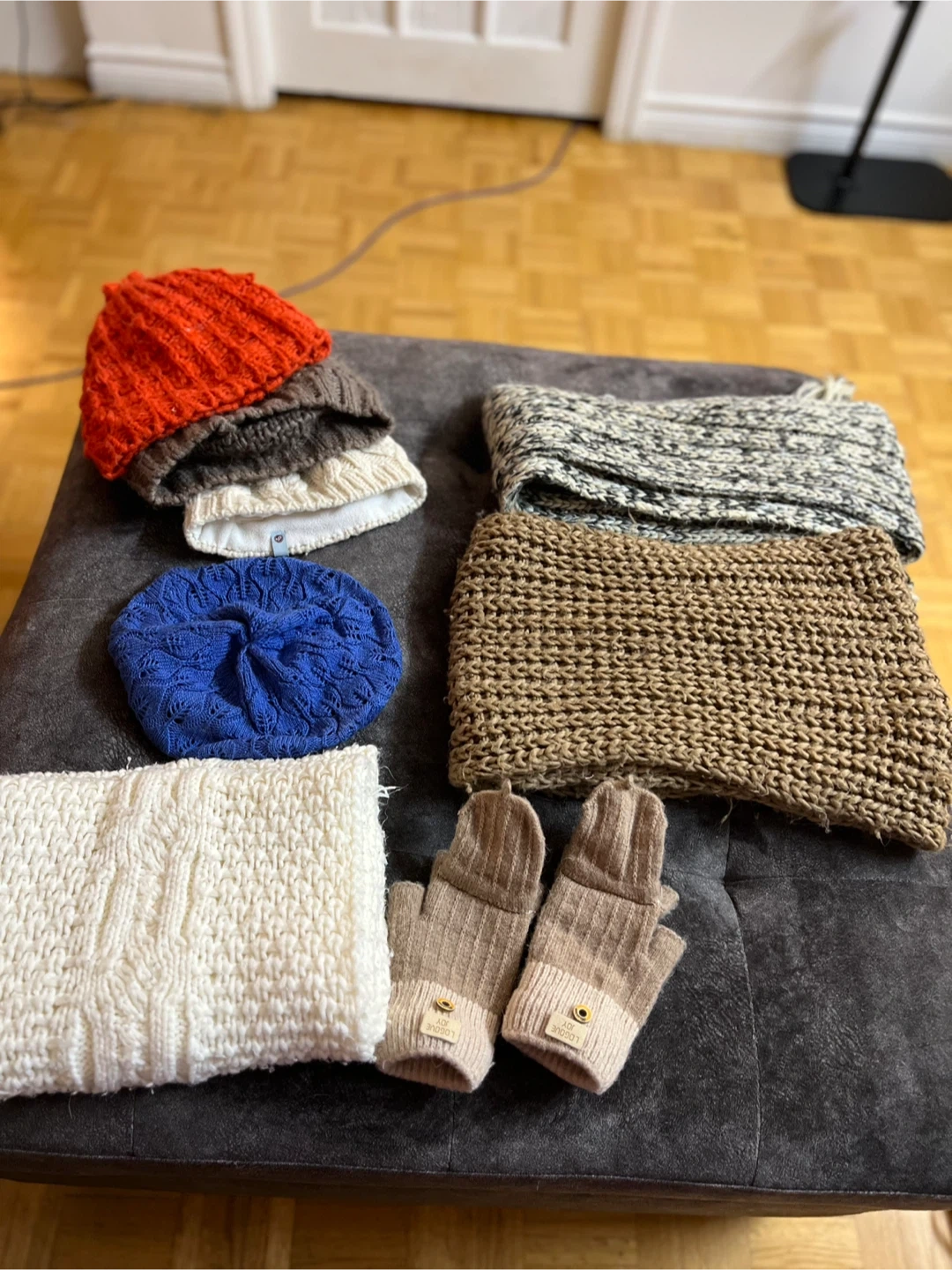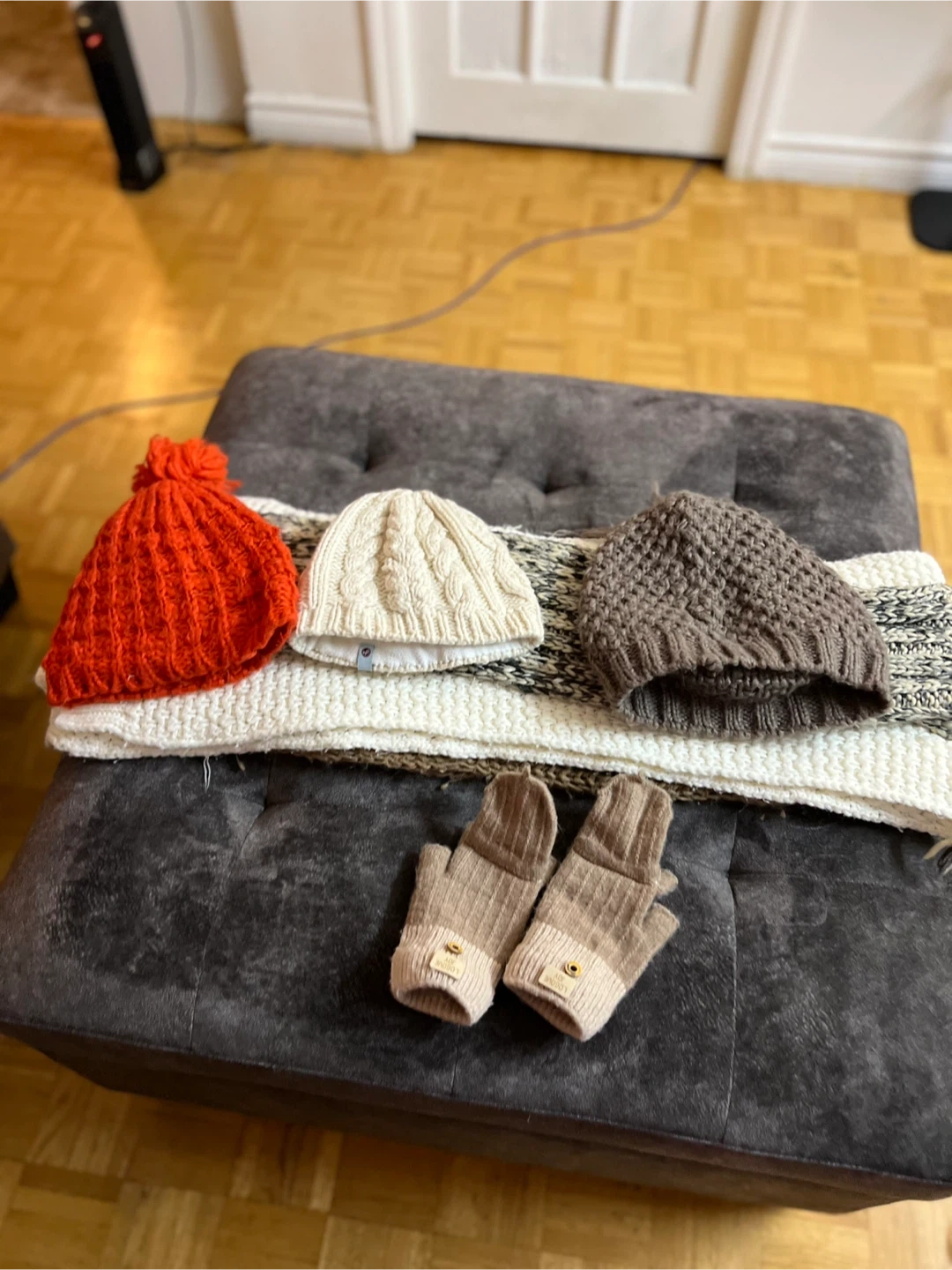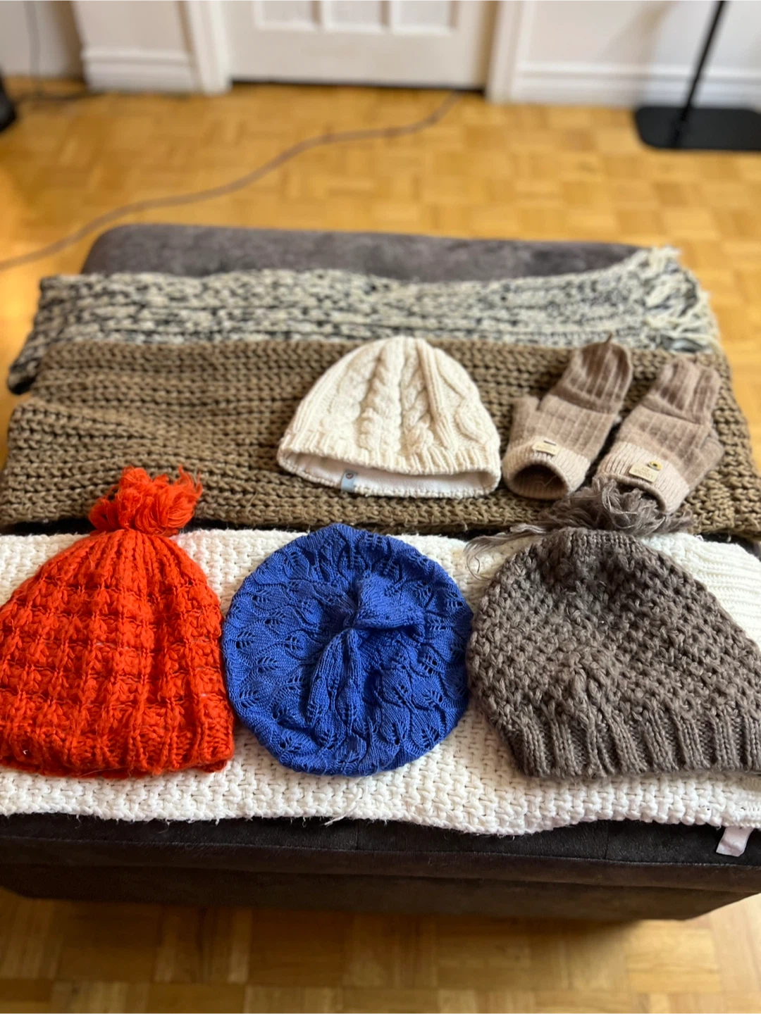 Bundle includes an orange pom-pom toque, a blue knit beret, a beige cable-knit toque, a brown textured toque, and a grey marled toque. Also includes a pair of beige knitted fingerless gloves. All items appear to be knit materials.