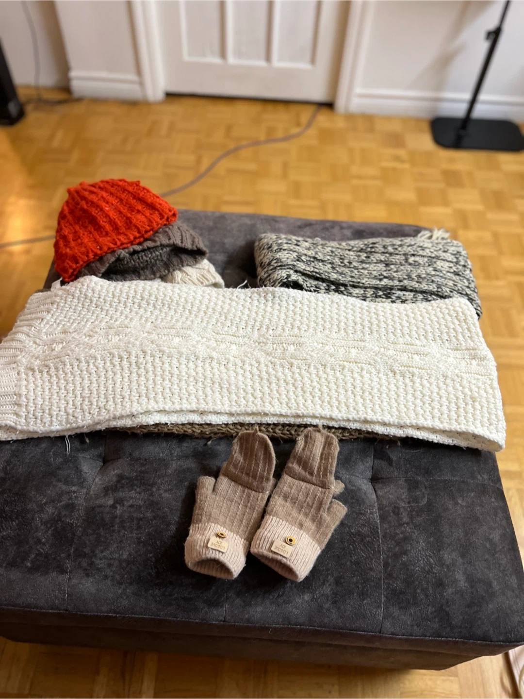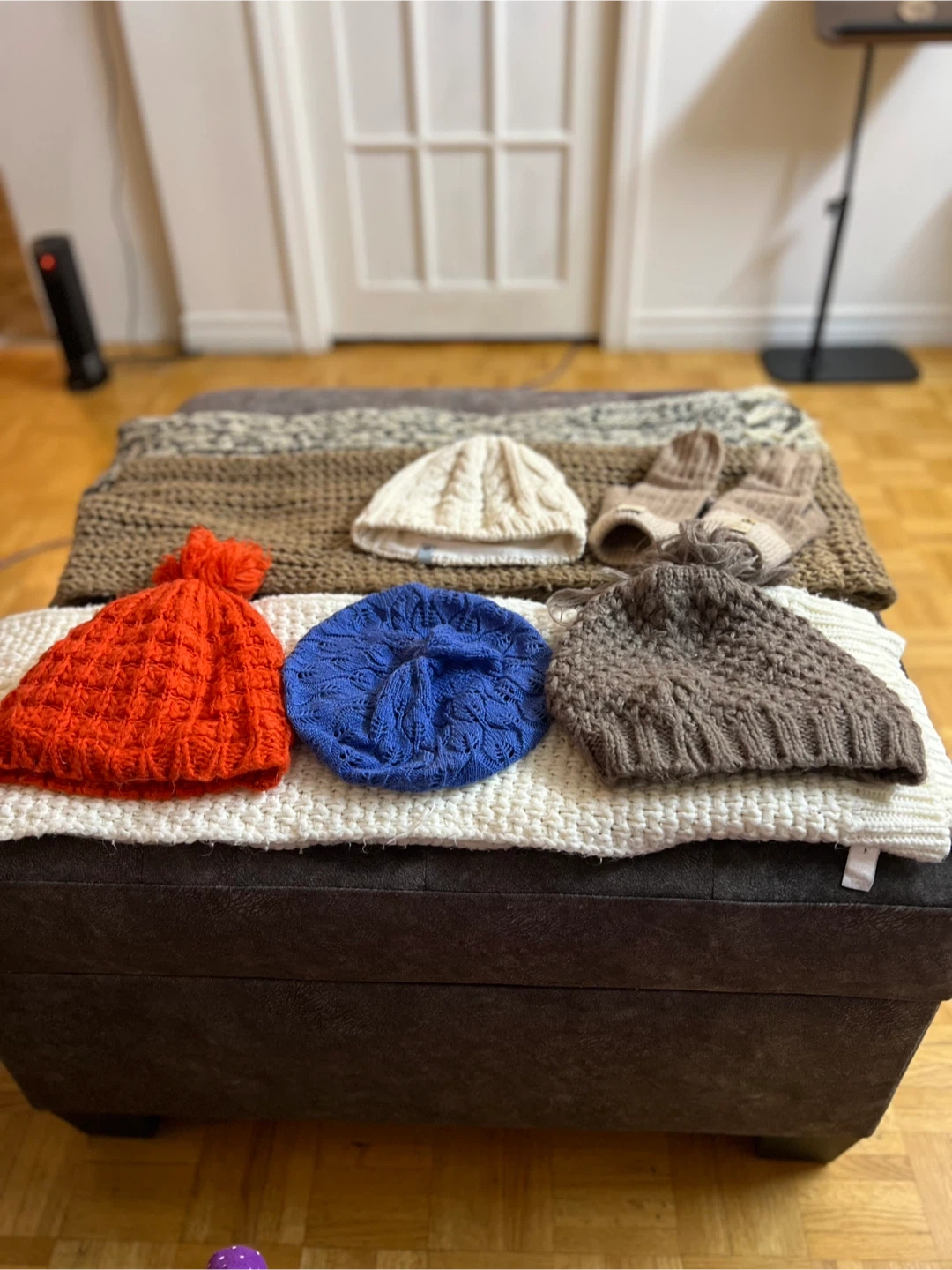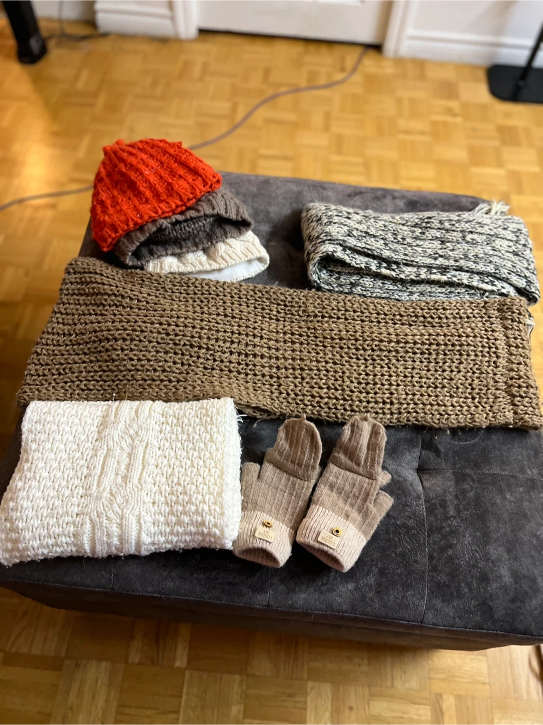 Bundle includes an orange pom-pom toque, a blue knit beret, a beige cable-knit toque, a brown textured toque, and a grey marled toque. Also includes a pair of beige knitted fingerless gloves. All items appear to be knit materials.