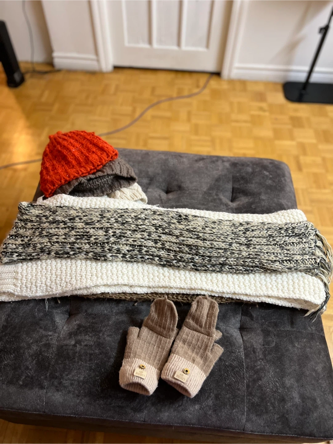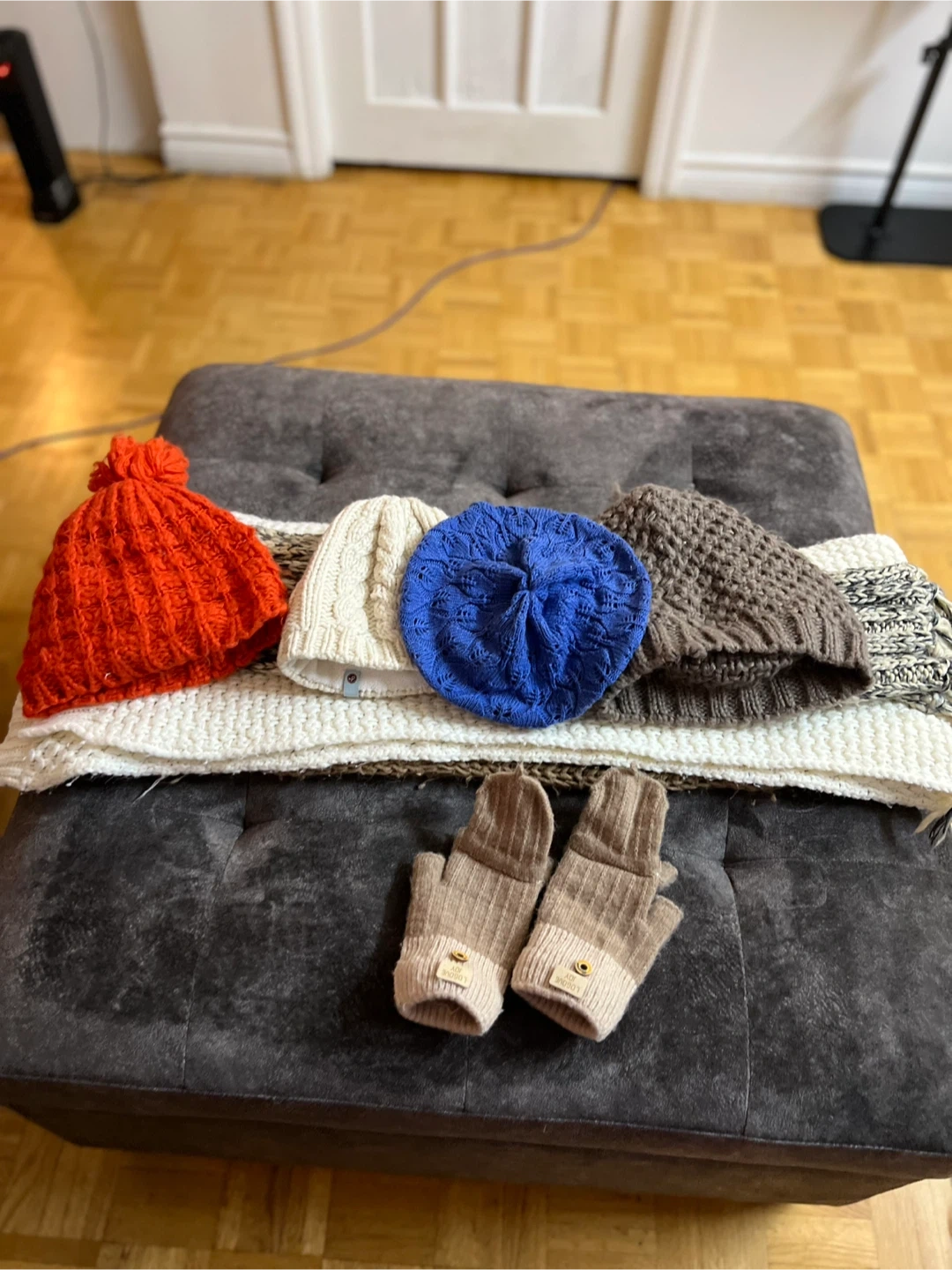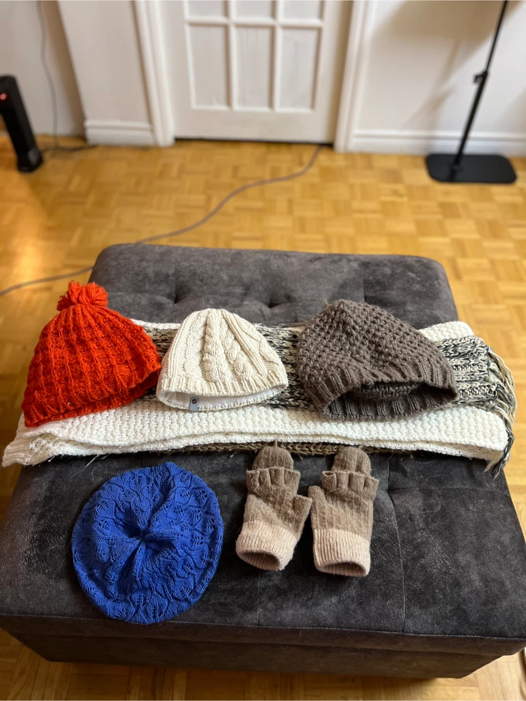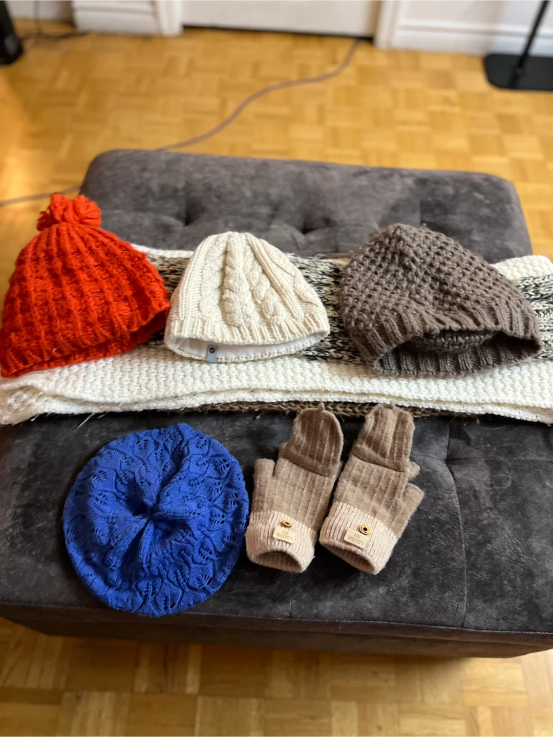 Bundle includes an orange pom-pom toque, a blue knit beret, a beige cable-knit toque, a brown textured toque, and a grey marled toque. Also includes a pair of beige knitted fingerless gloves. All items appear to be knit materials.