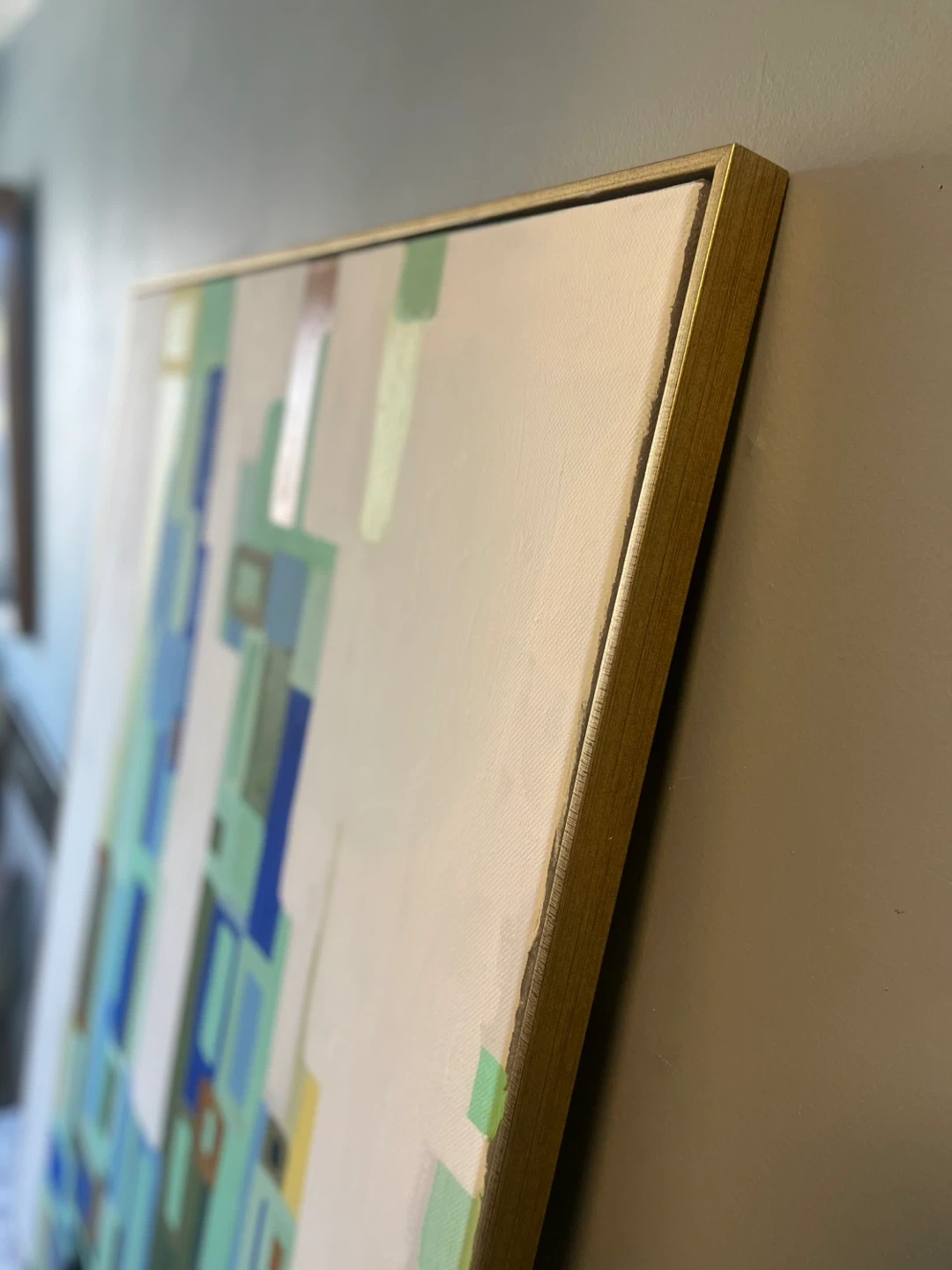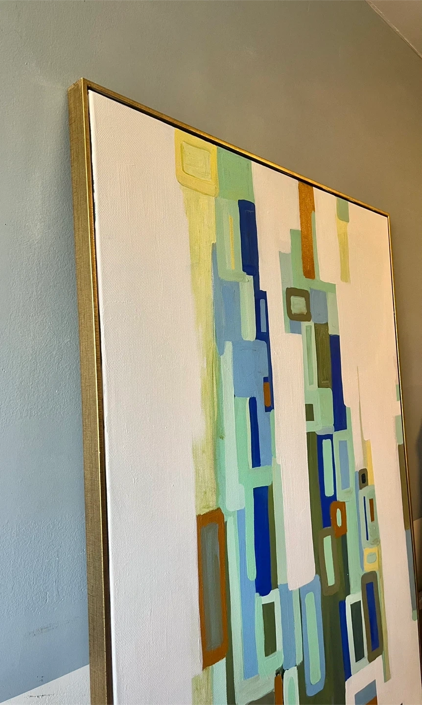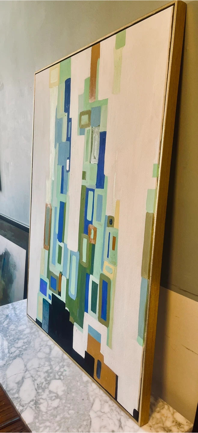 A modern abstract painting featuring a geometric design with a palette of blues, greens, and earthy tones. It's framed in a sleek gold-coloured metal frame. This piece adds a contemporary touch to any room!