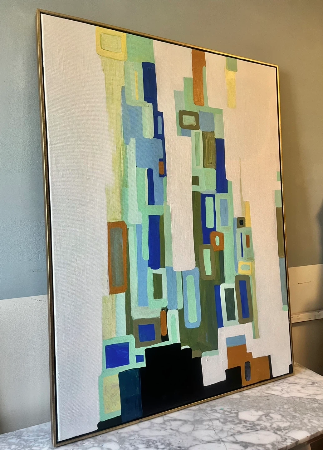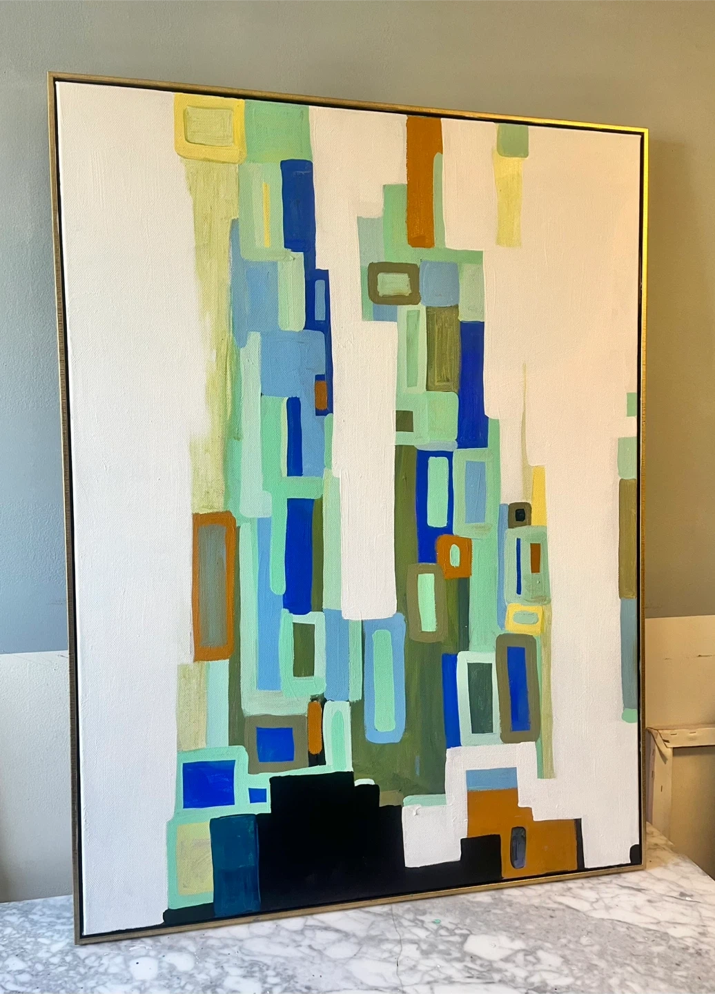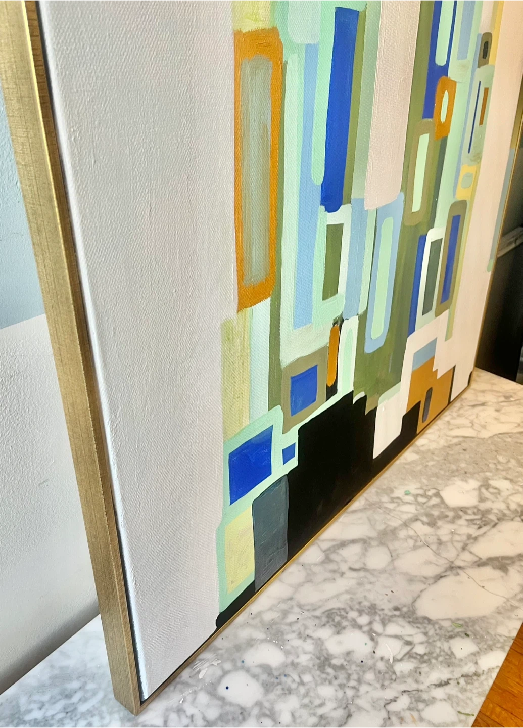 A modern abstract painting featuring a geometric design with a palette of blues, greens, and earthy tones. It's framed in a sleek gold-coloured metal frame. This piece adds a contemporary touch to any room!