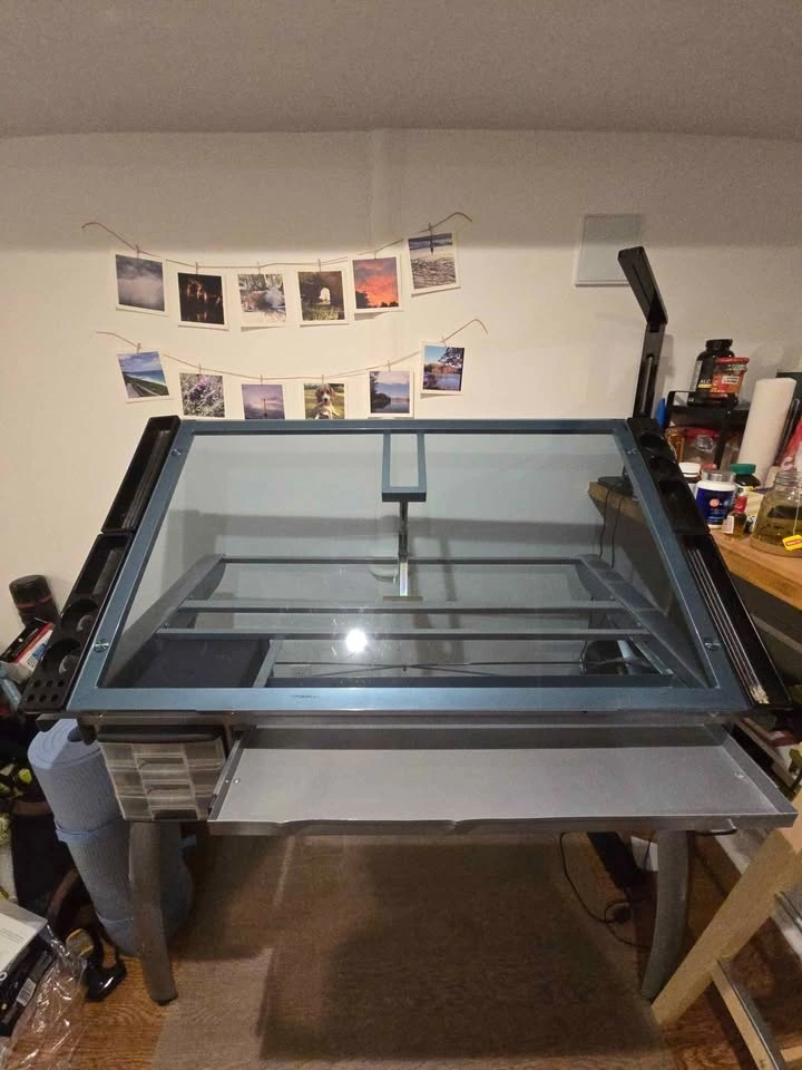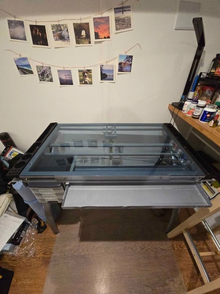 Used but in good condition. There are damages on the metal drawer (bent, see picture). Main work surface: 38''W x 24''D. Pencil drawer dimensions: 28''W x 10"D. The item is already disassembled in a few pieces and comes with the original instruction booklet. Cash and pick up only. You will need a car as this item is quite big and heavy. Located at Lansdowne and Lappin.
