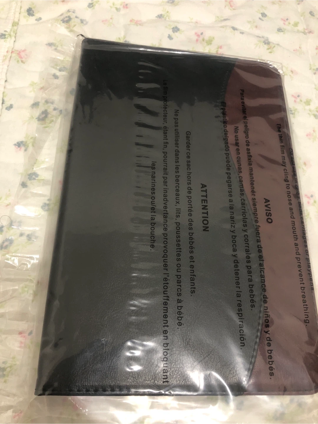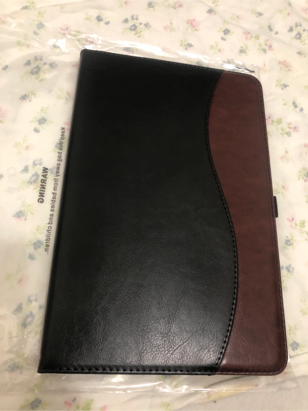 This versatile tablet case offers protection and style. It features a sleek black exterior with a contrasting brown wave accent. It includes an elastic band for secure closure and internal slots for cards or documents. The case also has a built-in stand for hands-free viewing. Its durable construction safeguards your device from everyday wear and tear.