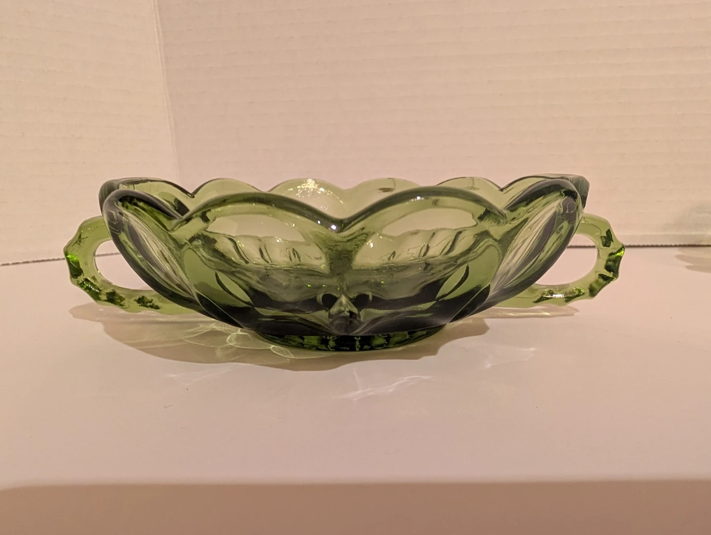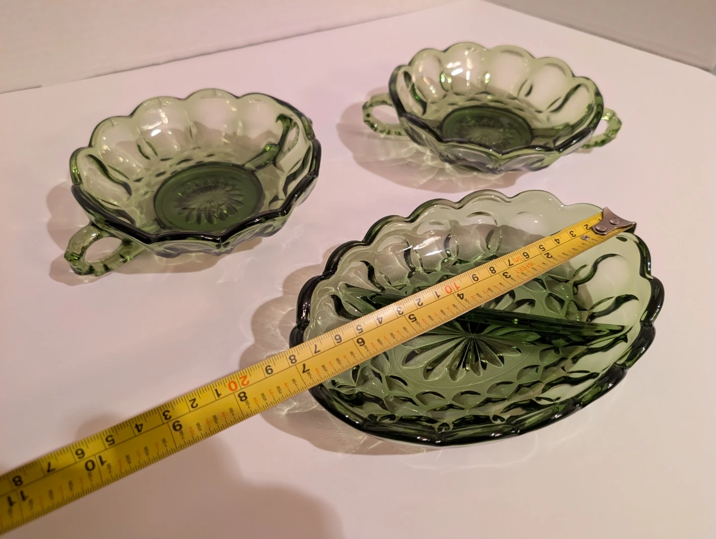 Set of vintage Anchor Hocking Fairfield Avocado green glass serving dishes. Includes 2 bowls with a fluted edge and handles and one larger oval divided dish. Great for serving snacks or small dishes!