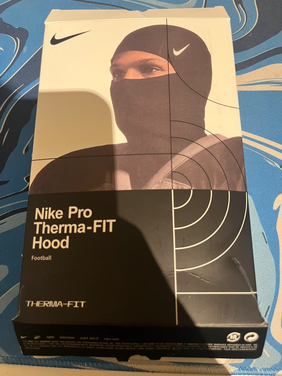 This is a Nike Pro Therma-FIT Hood designed for football. It's made with Therma-FIT technology for warmth. This hood offers full face coverage.