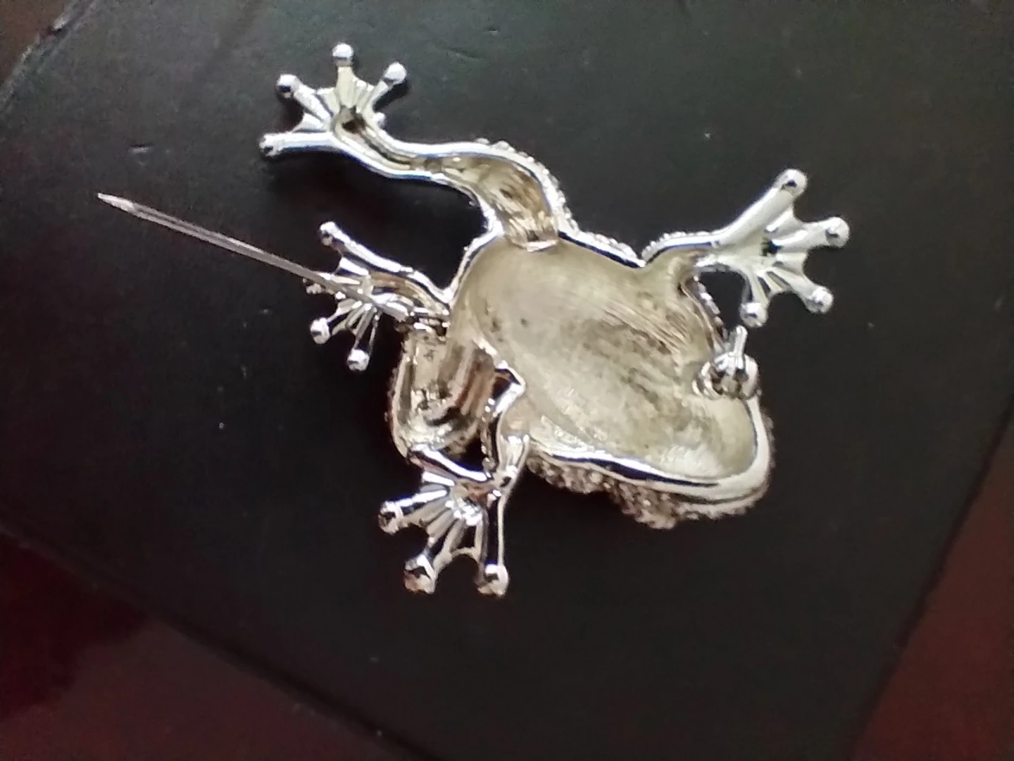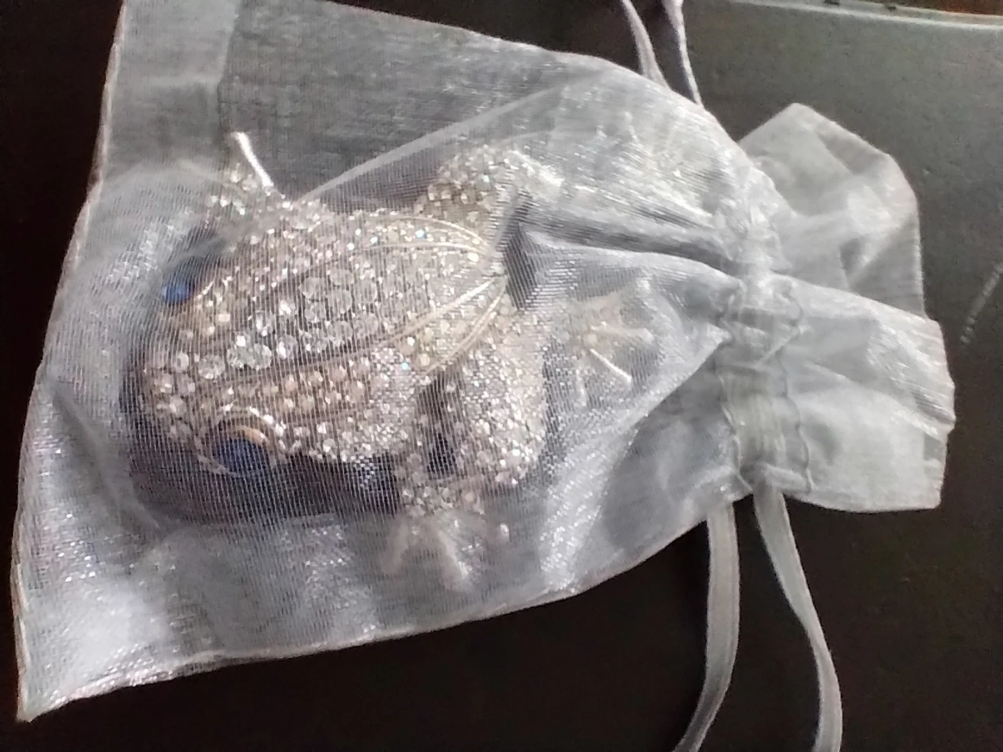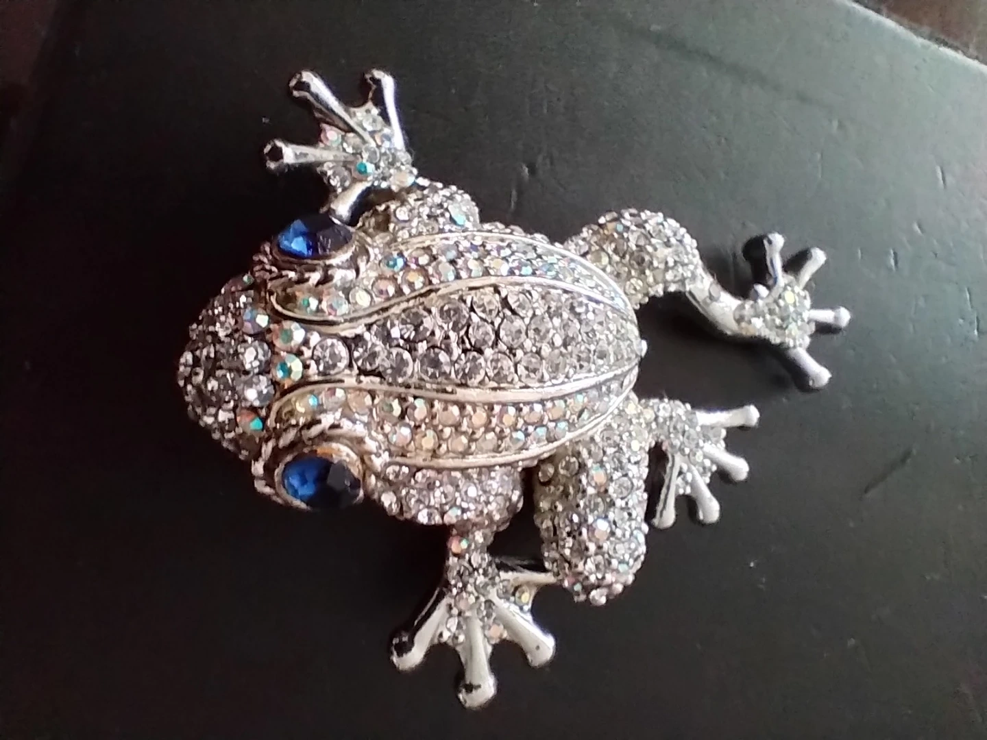 Sparkly frog brooch covered in clear rhinestones with blue gem eyes. It comes in a sheer organza pouch. This piece is embellished with many small clear crystals and two larger blue stones for eyes.