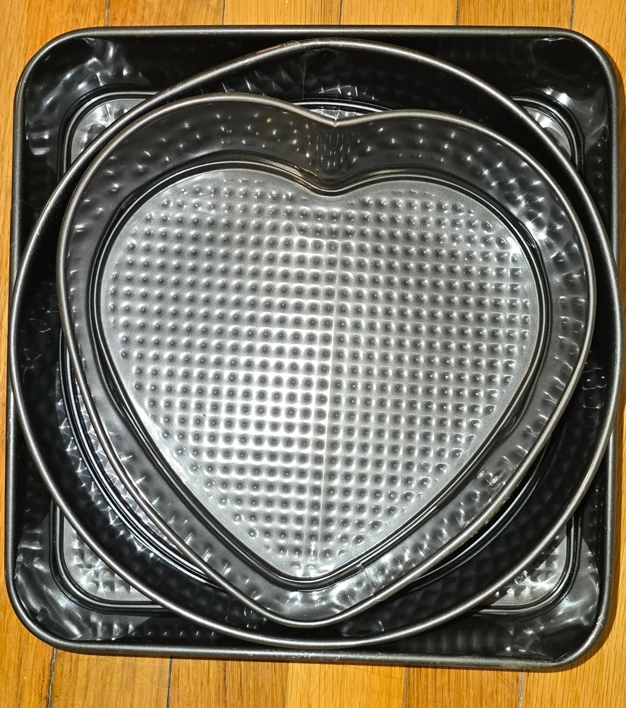 This set includes a heart-shaped cake pan, a round cake pan, and a square cake pan. All pans feature a textured interior. Baking pans are made of metal.
