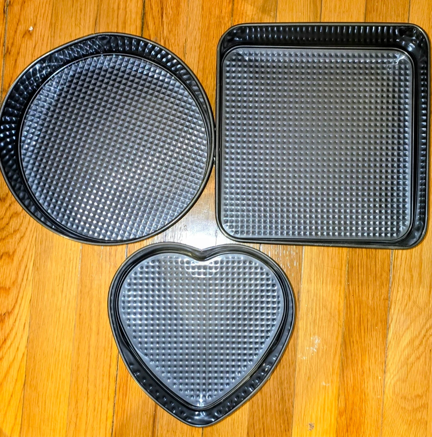 This set includes a heart-shaped cake pan, a round cake pan, and a square cake pan. All pans feature a textured interior. Baking pans are made of metal.