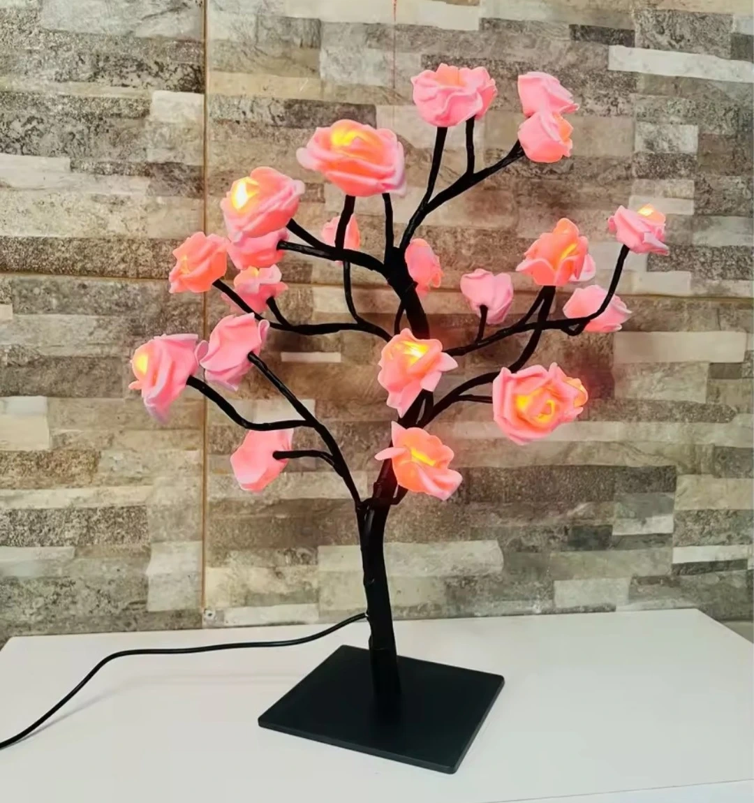 A decorative LED lamp designed to look like a rose tree. It features many pink rose-shaped lights that emit a warm glow. This lamp is powered by a cord and sits on a black square base.