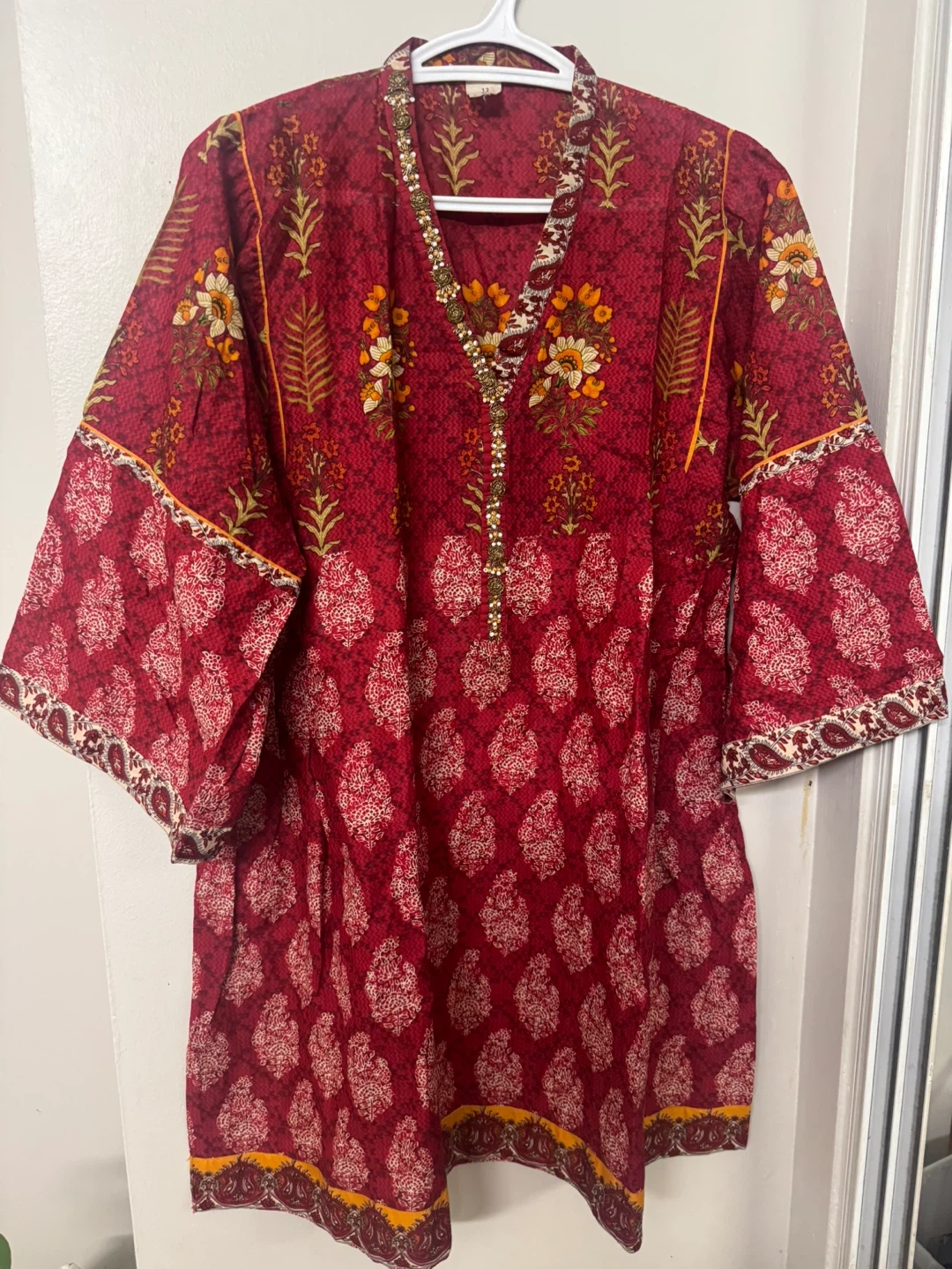 This women's kurti features a vibrant red base with a beautiful all-over floral print. It comes with a matching dupatta and off white shalwar, also adorned with a complementary print. The neckline is embellished with delicate beadwork for a touch of elegance. It's perfect for casual wear or festive occasions!