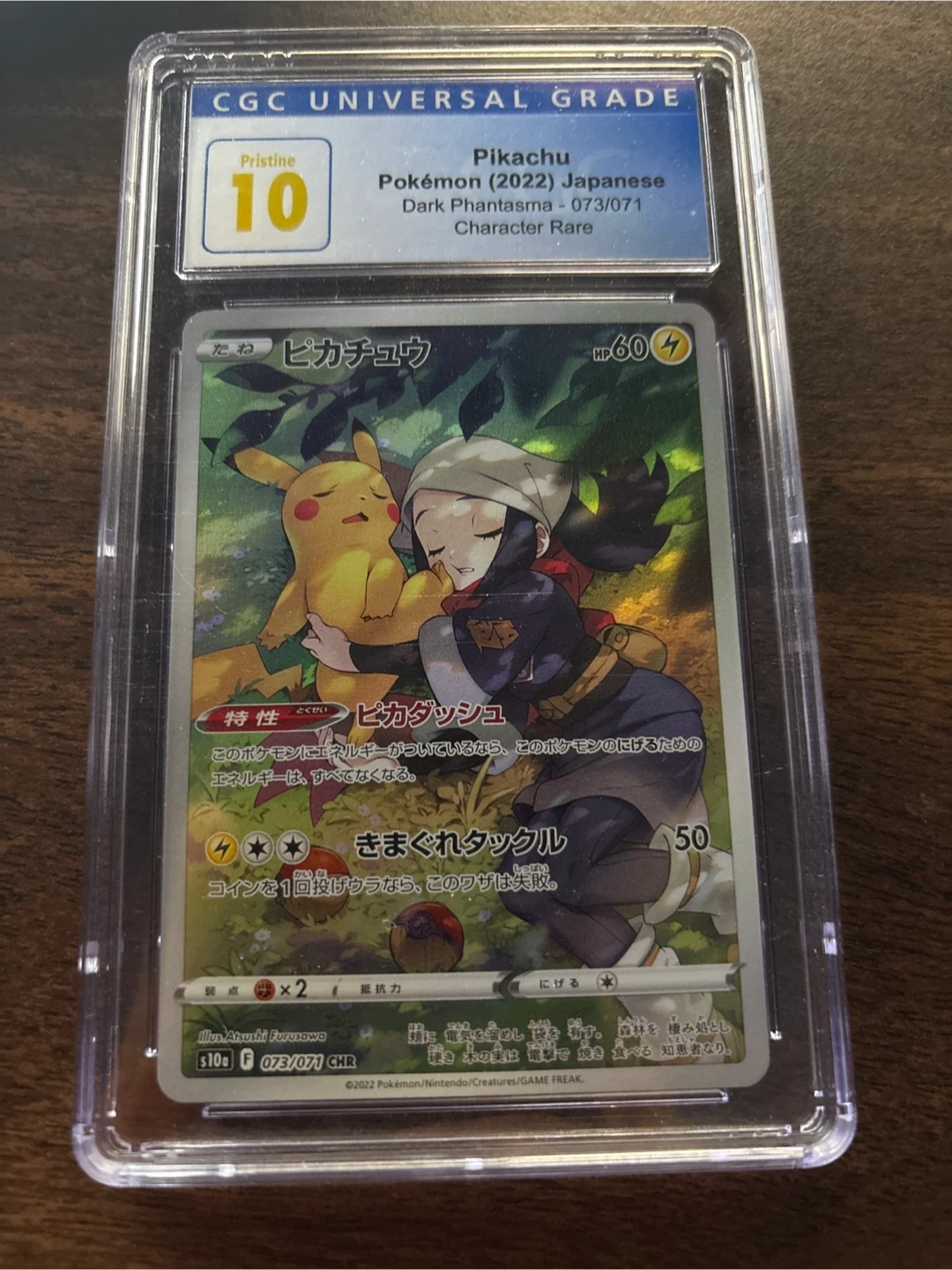 This is a CGC graded 'Pristine 10' Japanese Pikachu Character Rare card from the 2022 Dark Phantasma Pokémon set. The card number is 073/071. It features the ability 'Pikadash' and the move 'Random Tackle'.