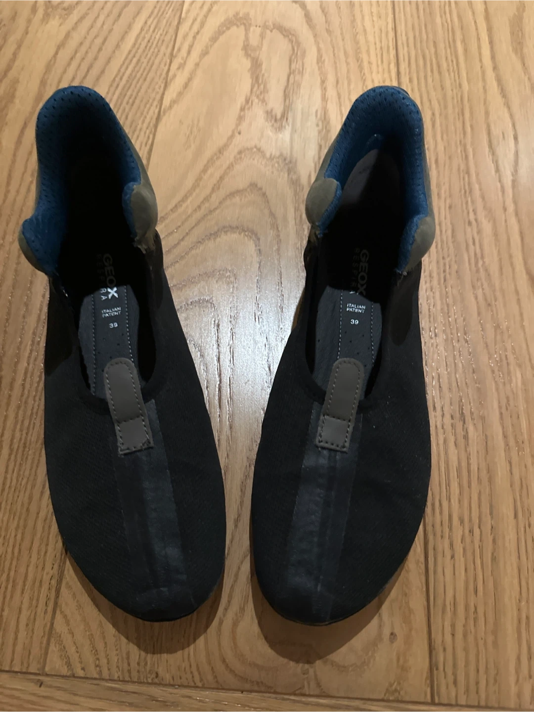 These Geox Amphibiox shoes are black with blue accents and a size of 39. They're designed for breathability and water resistance. Great for casual wear or light outdoor activities.