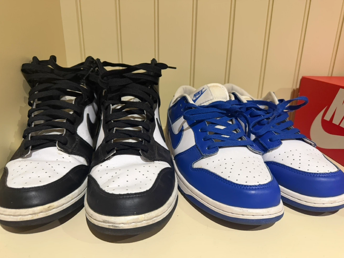 Two pairs of Nike Dunk sneakers. One pair is a blue and white low-top, and the other is a black and white high-top. Both pairs feature the iconic Nike swoosh.