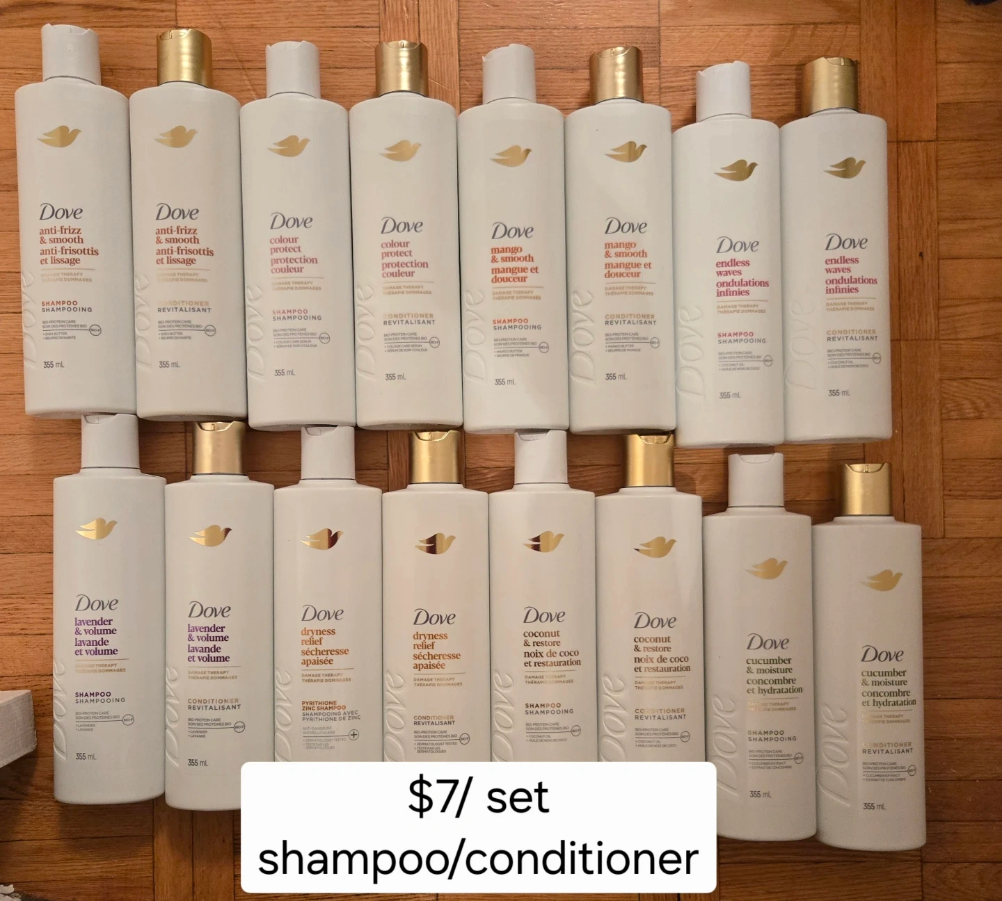 Assorted Dove shampoo and conditioner bottles are available. Each bottle contains 355 mL. Varieties include anti-frizz, colour protect, mango & smooth, endless waves, lavender & volume, dryness relief, coconut & restore, and cucumber & moisture.