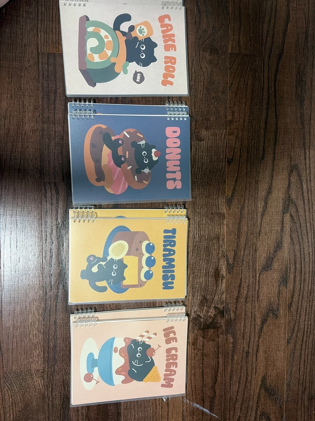 Adorable set of four spiral-bound notebooks featuring cute cats and dessert designs like Tiramisu, Donuts, Cake Roll, and Ice Cream. These notebooks are perfect for jotting down notes or as a fun gift!