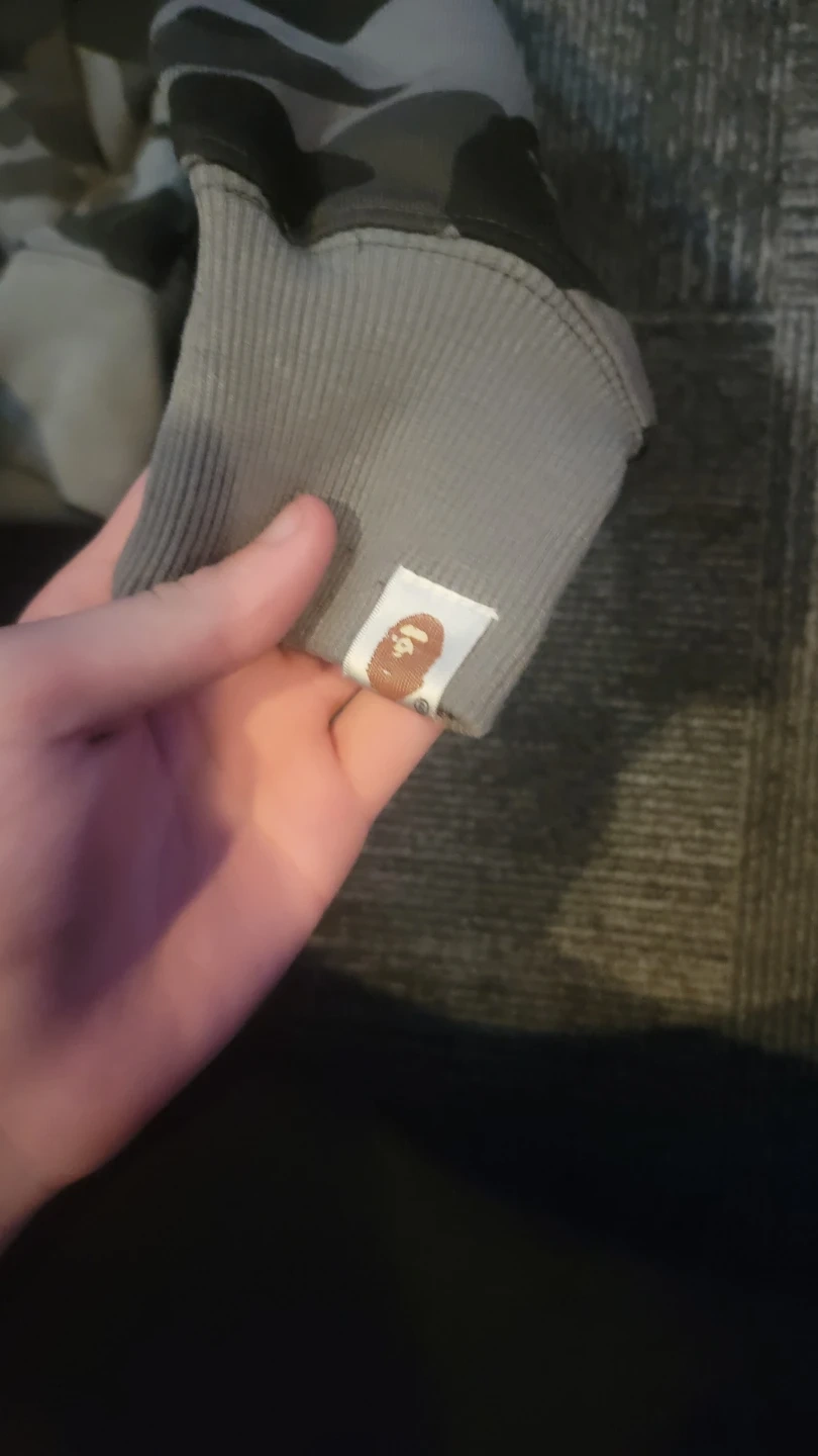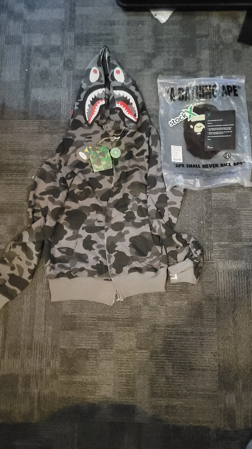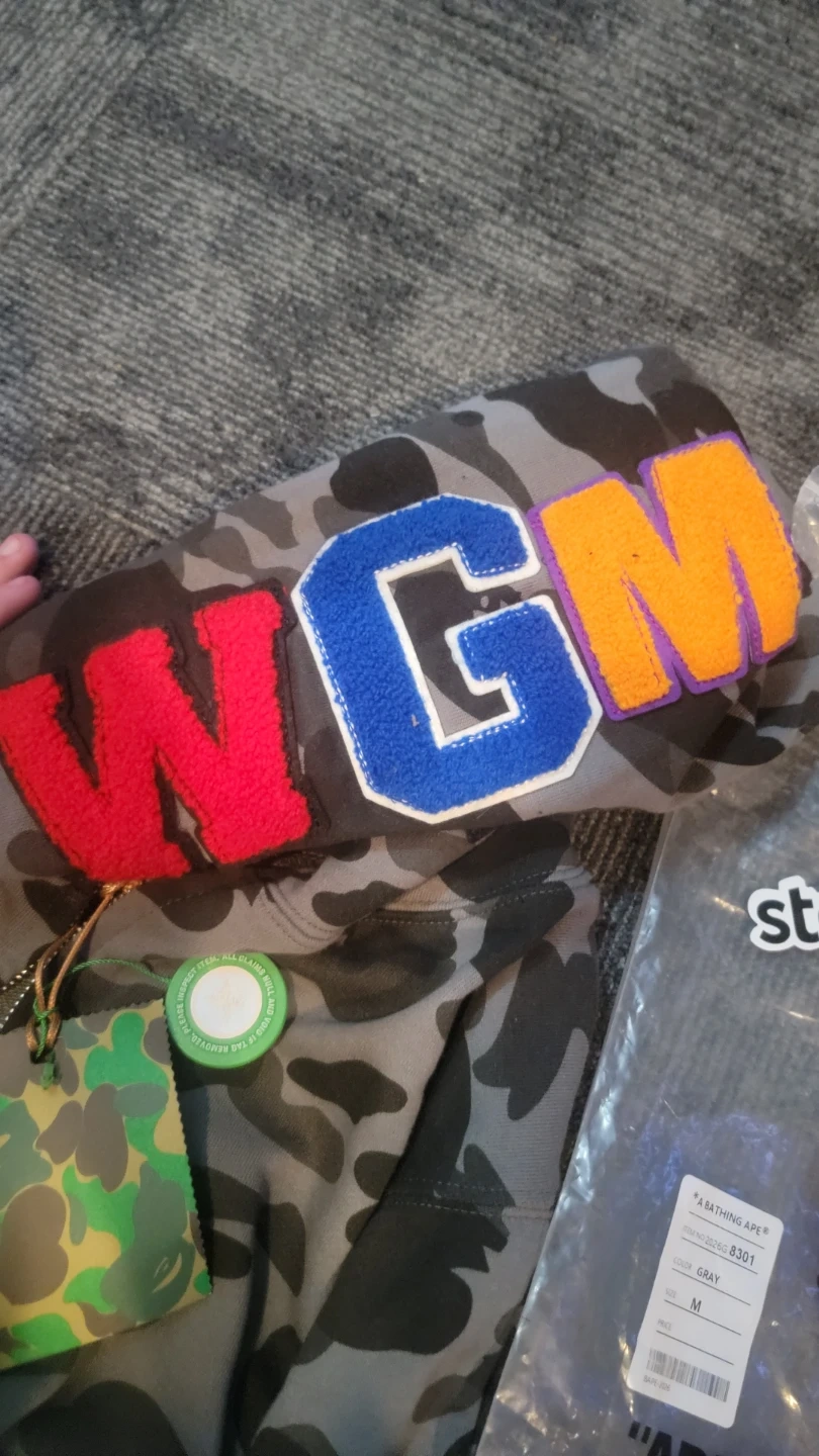 This is an A Bathing Ape full zip hoodie with a grey camouflage pattern. It features the iconic shark design and 'WGM' lettering. Made of 100% cotton. Fully authentic bought from stock x