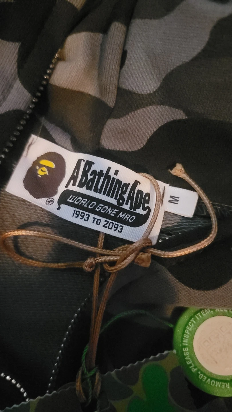 This is an A Bathing Ape full zip hoodie with a grey camouflage pattern. It features the iconic shark design and 'WGM' lettering. Made of 100% cotton. Fully authentic bought from stock x