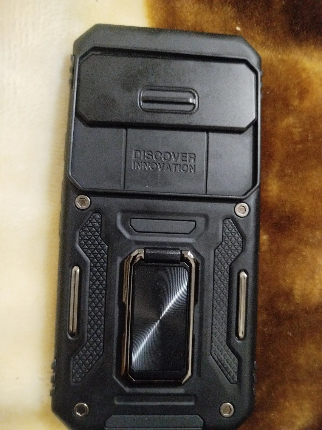 This is a rugged black phone case. It features a built-in kickstand for hands-free viewing. The case provides good protection and has a textured grip.