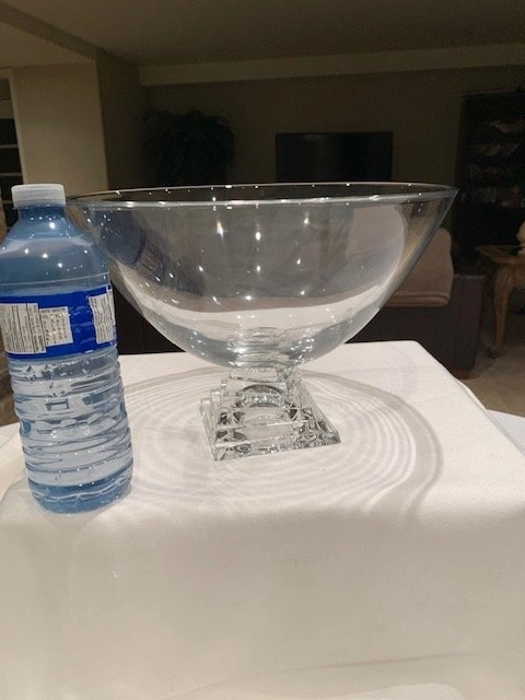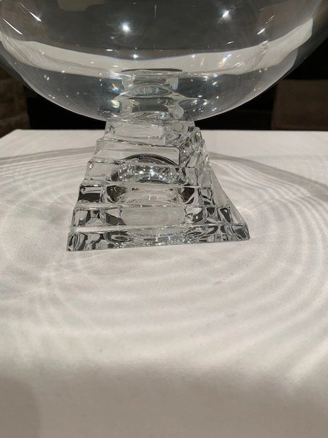 Vintage JG Durand Cristal pedestal bowl with a stacked square base. Made of clear crystal and manufactured in France. The design is modernist with a distinctive geometric base. Can be used as a fruit bowl, serving bowl, or decorative centerpiece. Measures 11" wide and 8" high. Mint condition, no chips or cracks. From a smoke-free, pet-free home. Located in Richmond Hill (Bathurst and King Rd).